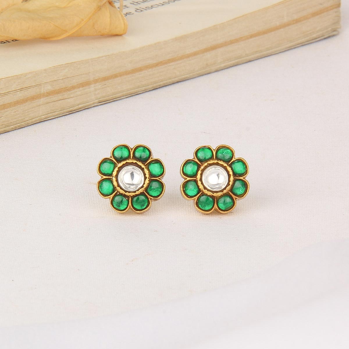 This 92.5 Silver, 24 kt Gold-Plated Earring is adorned with Semi-precious Kundan Stones for a luxurious aesthetic.