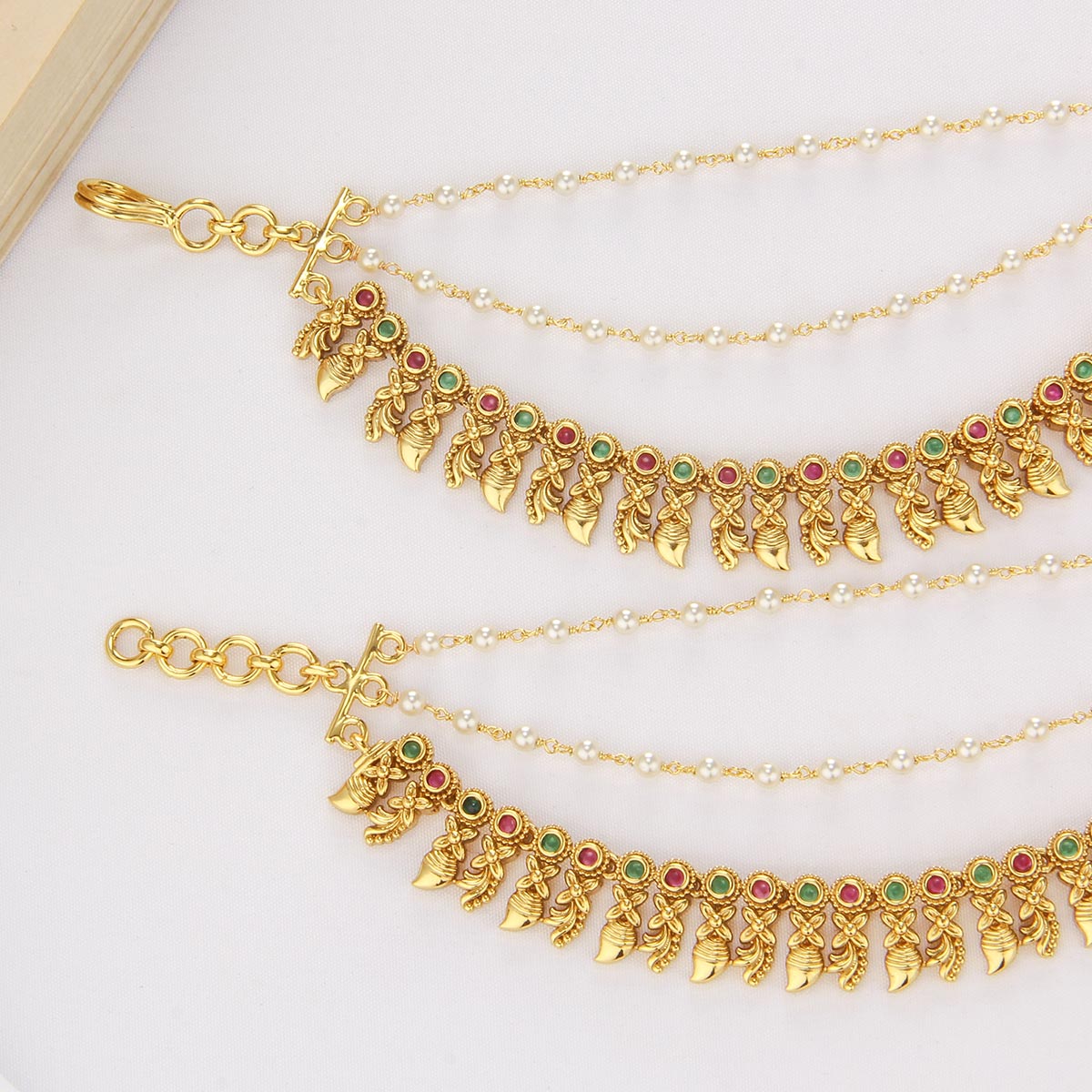 Crafted from 92.5 Sterling silver and 24kt gold-plated, Maatal is studded with Semi precious stones to create a stunning look.