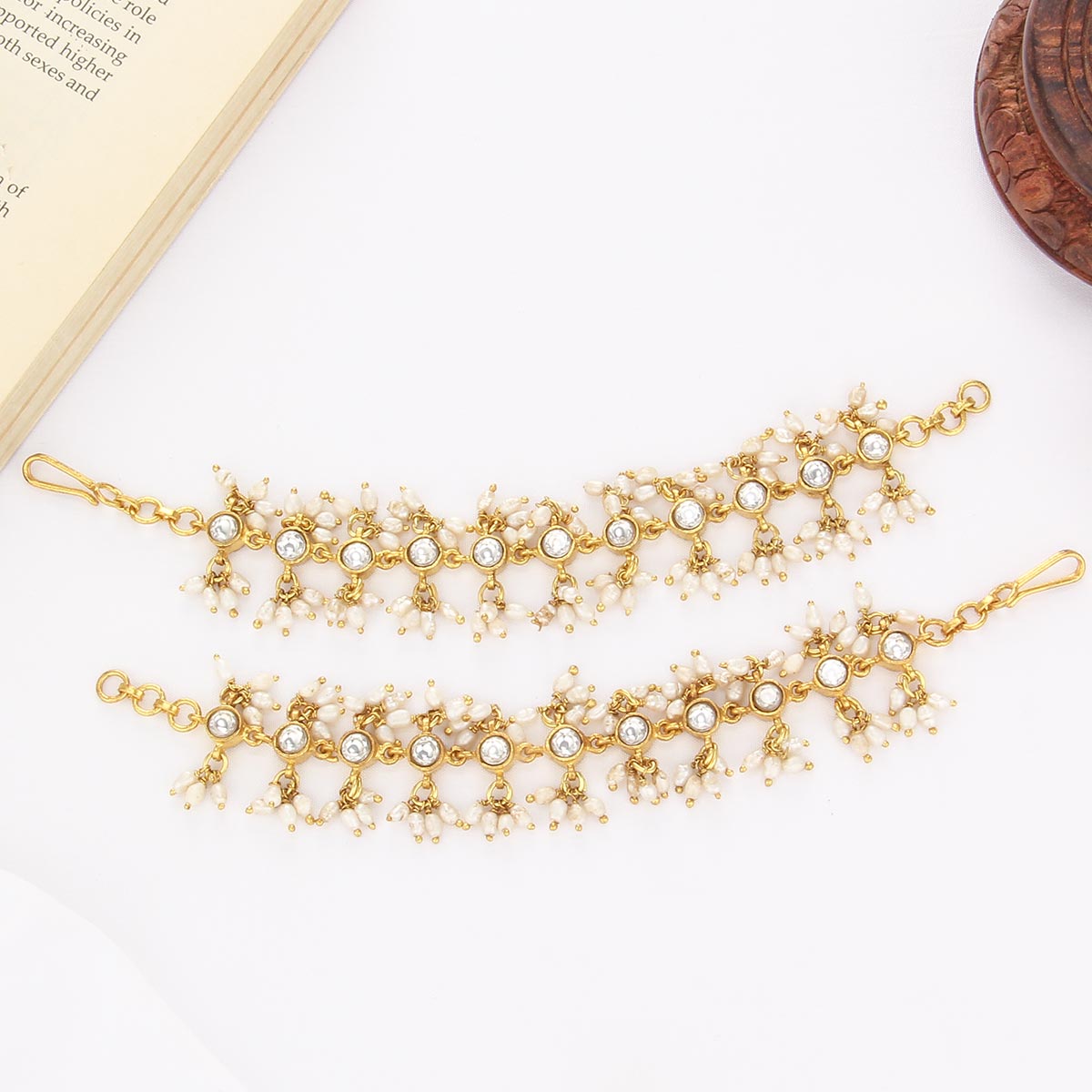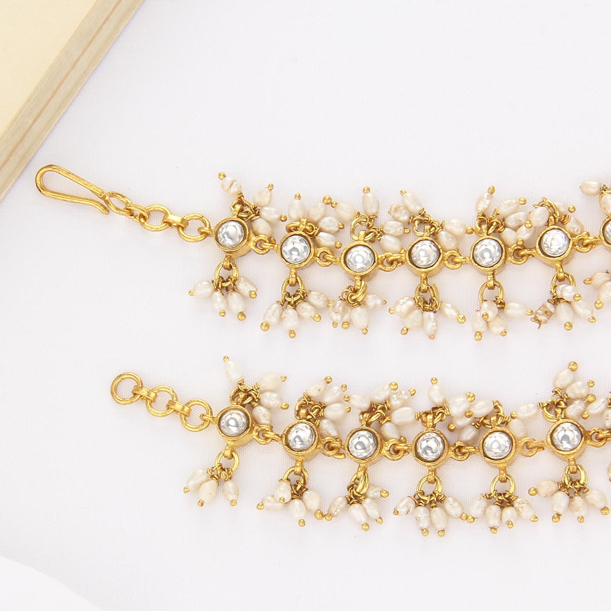 Crafted from 92.5 Sterling silver and 24kt gold-plated, Maatal is studded with semi-precious Kundan stones to create a stunning look.