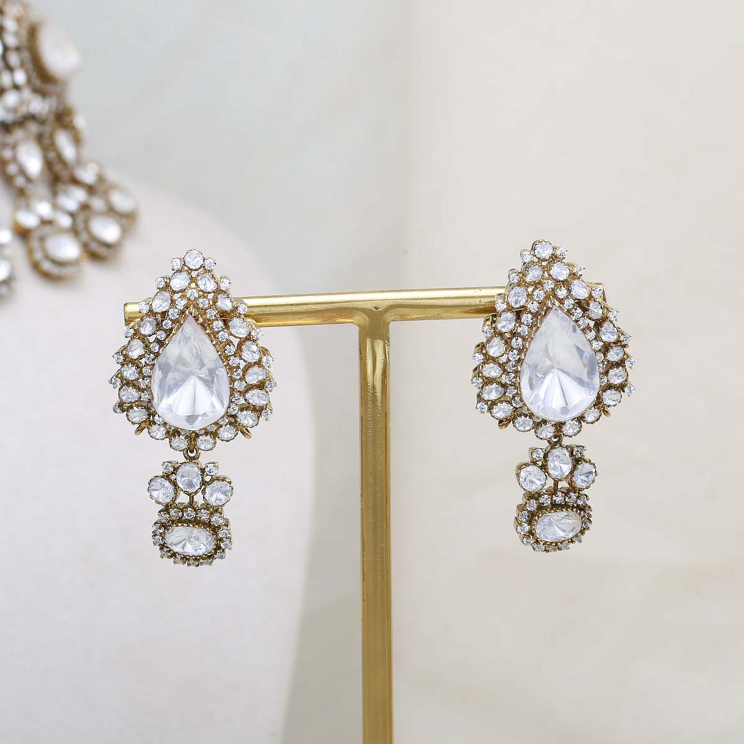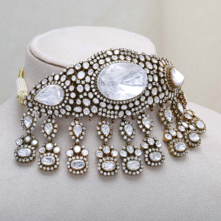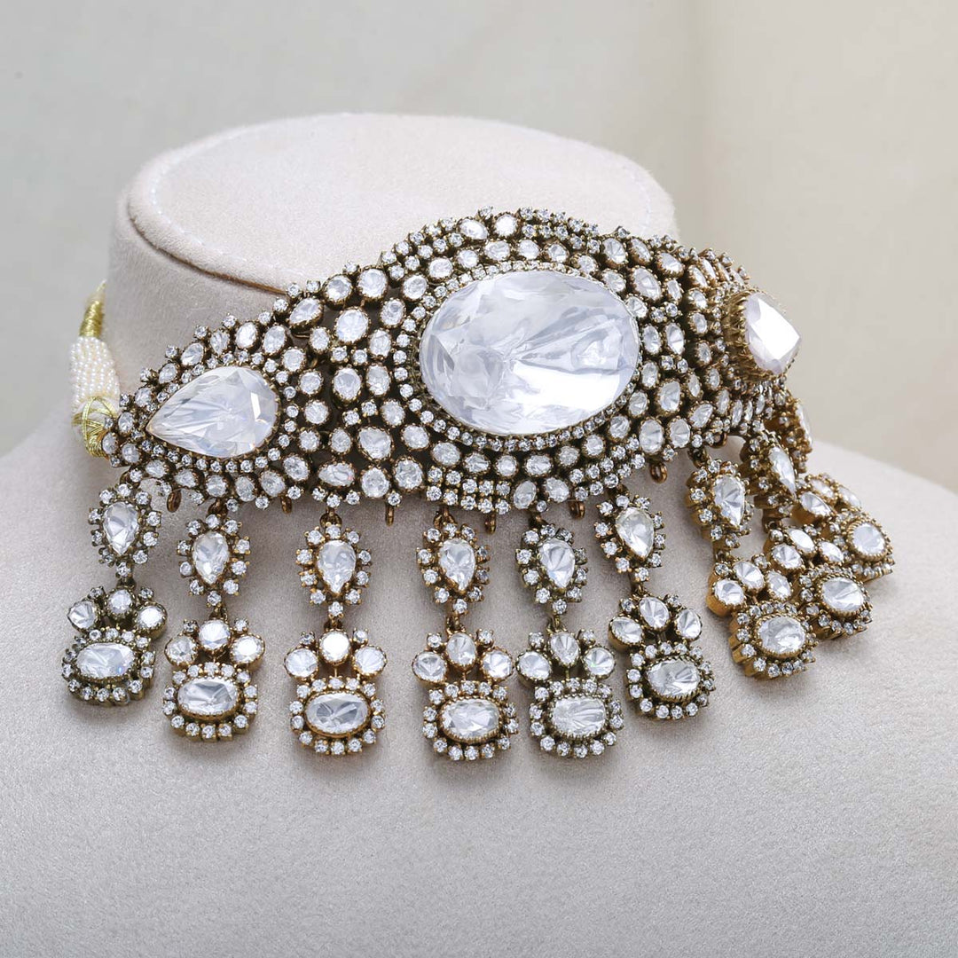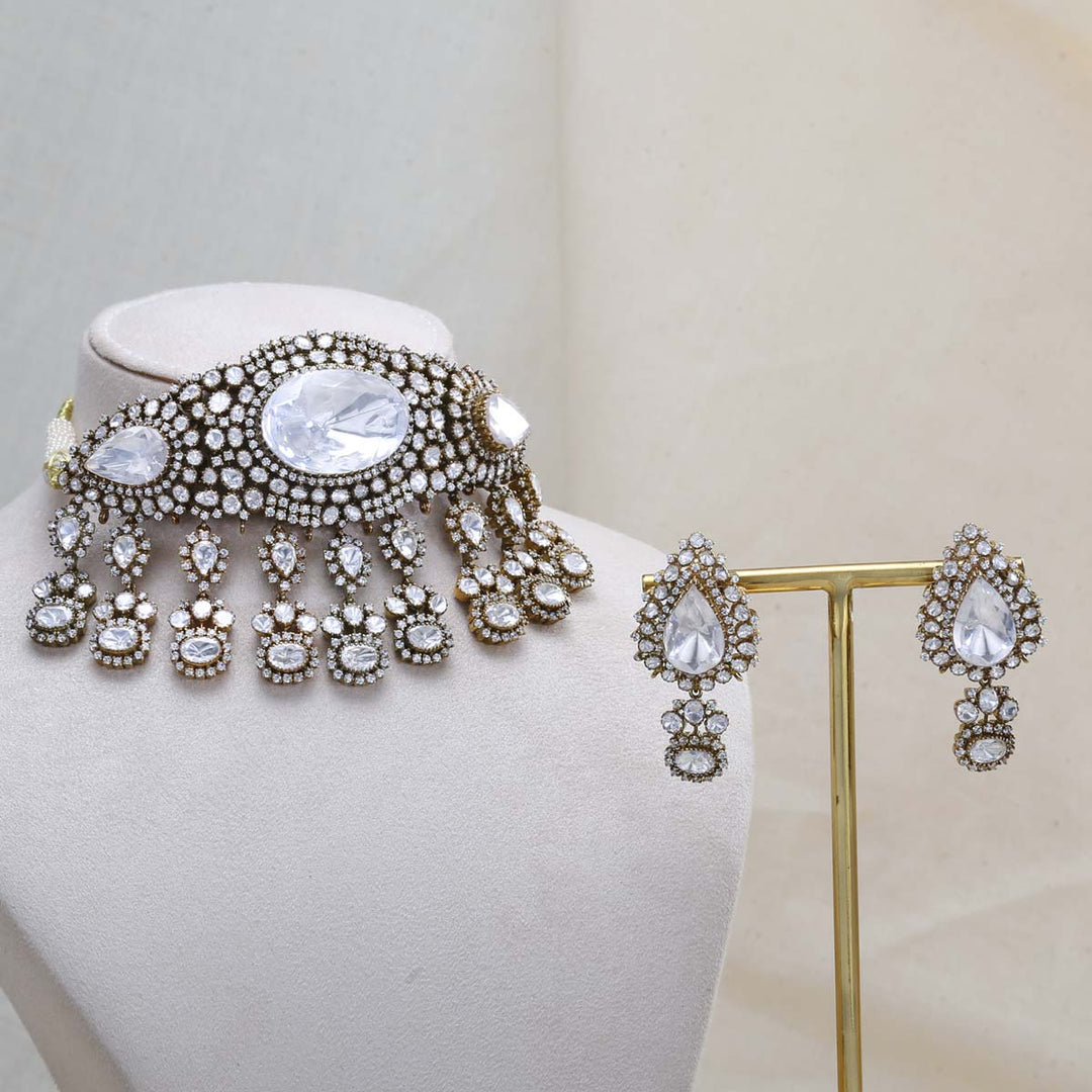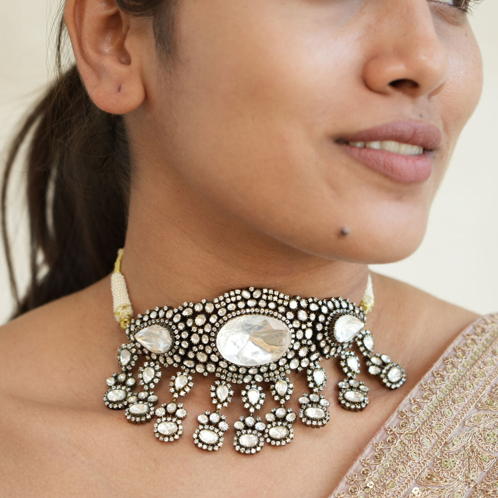 92.5 Silver, Victorian Necklace set studded with Gem Stones and Pearl Beads.
