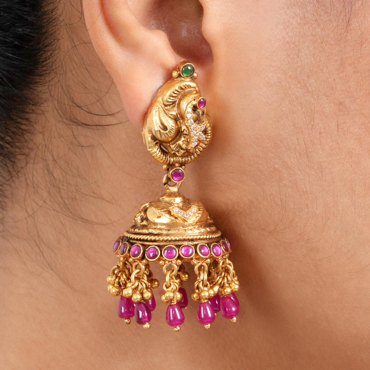 These Nagas Jhumkas are sure to elevate your look. Crafted with 92.5 silver and 24kt gold plating, they are embellished with Semi-Precious stones for a stunning finish.