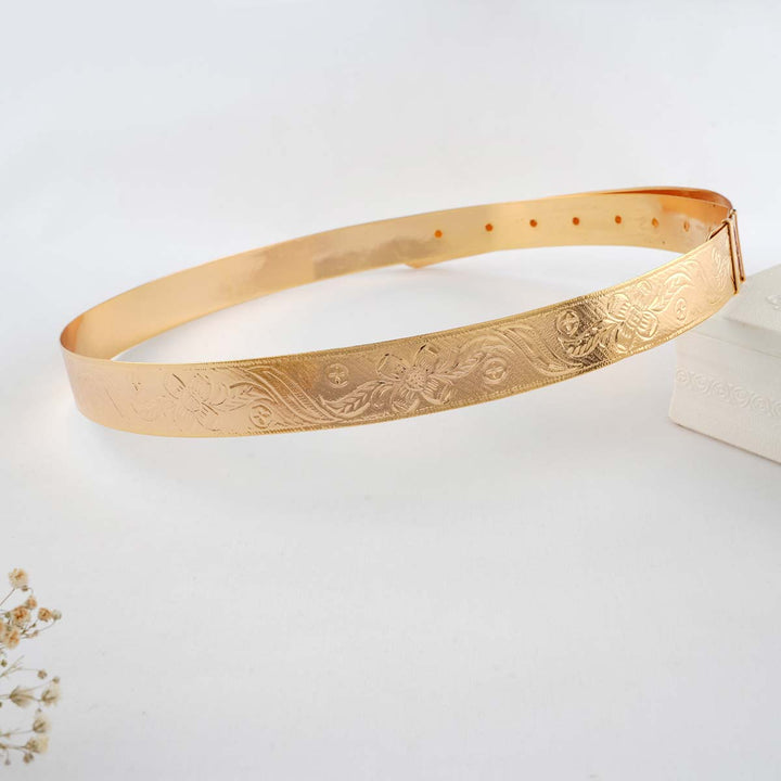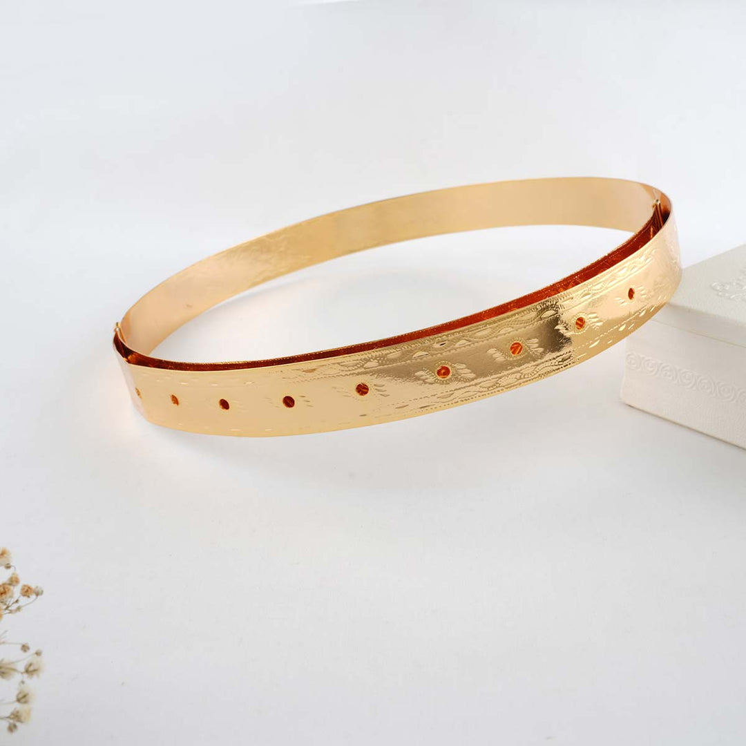 This silver waist belt in a traditional design is gold-dipped and has an adjustable belt at the back. The waist belt is adjustable to any waist size.