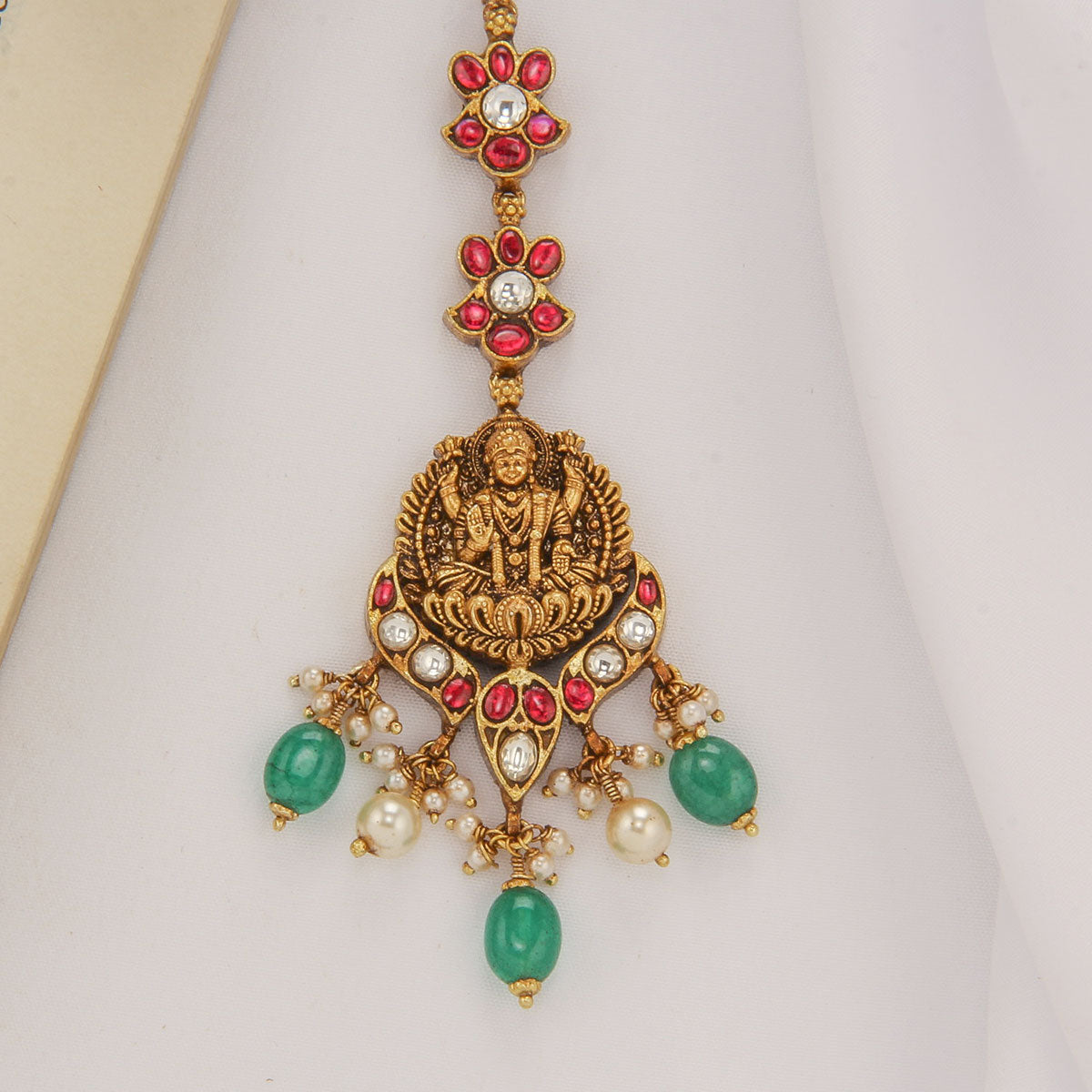 This exquisite Maangtikka will add a glamorous flair to your look. Crafted from 92.5 silver and 24kt gold-plated, it features semi-precious stones for a brilliant shine. Elevate your look with this luxurious Maangtikka.