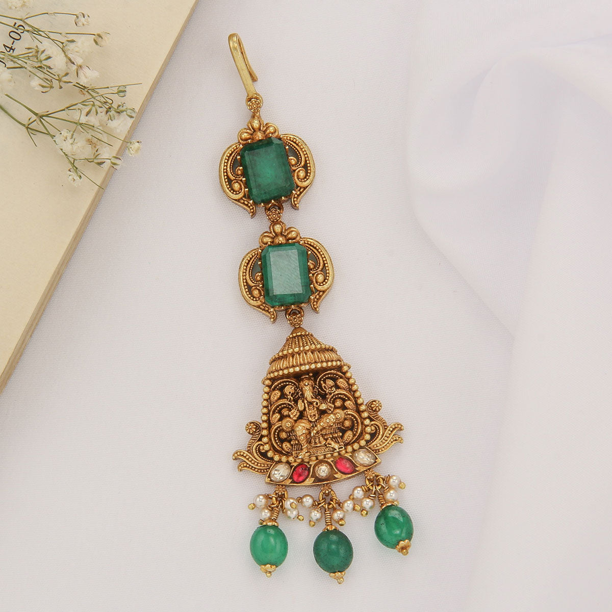 This exquisite Maangtikka will add a glamorous flair to your look. Crafted from 92.5 silver and 24kt gold-plated, it features semi-precious stones for a brilliant shine. Elevate your look with this luxurious Maangtikka.