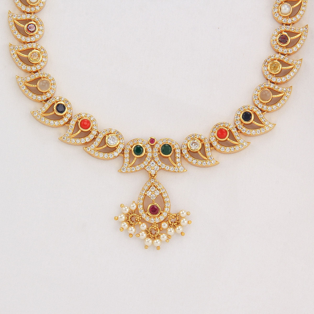 This 92.5 Silver, 24 kt gold-plated stylish Necklace is studded with semi-precious stones to make a stunning statement. Perfect for any special occasion.