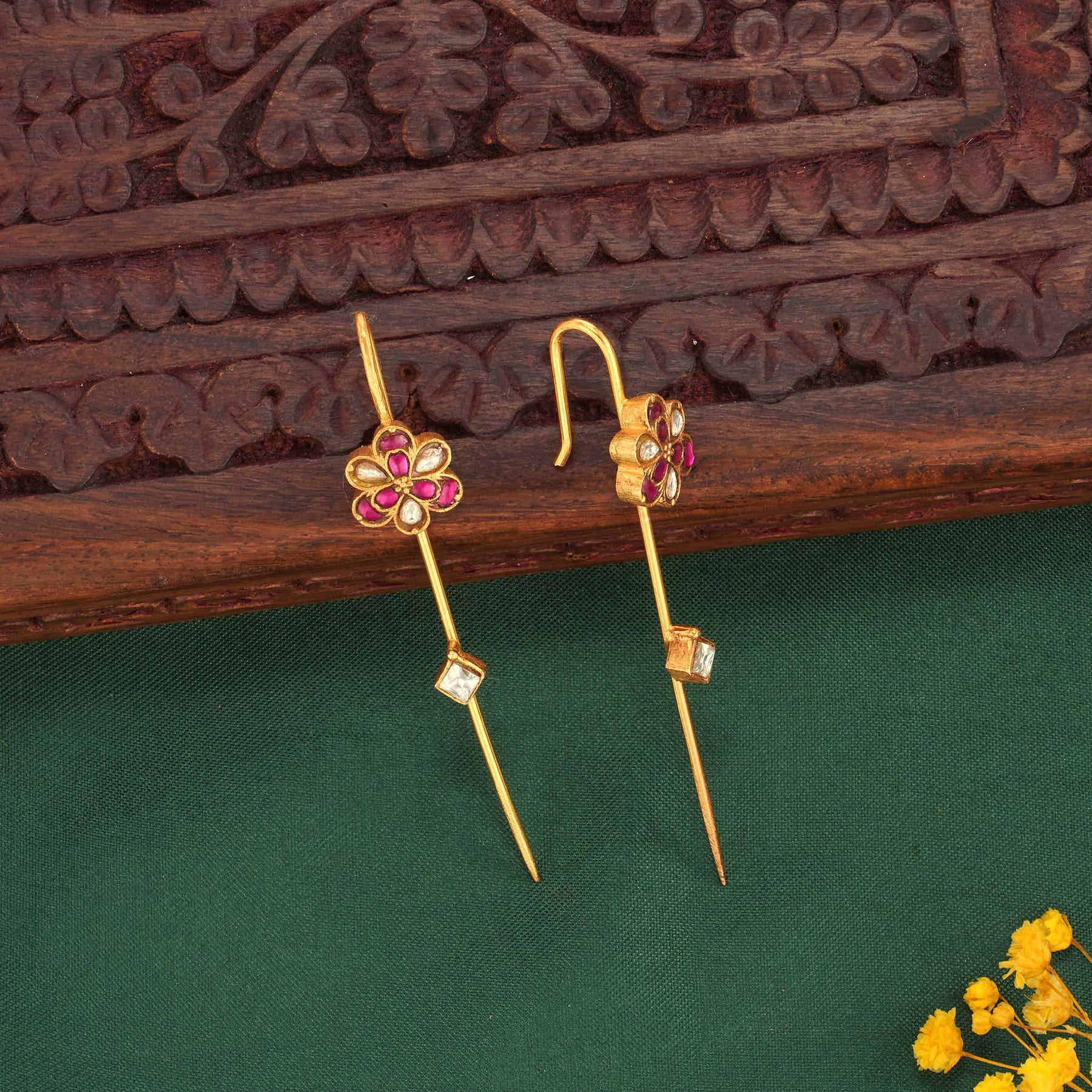 These 92.5 Silver, 24 kt Gold-Plated Needle Ear cuffs are adorned with Semi-precious Kundan Stones, pink with white stones for a luxurious aesthetic.
