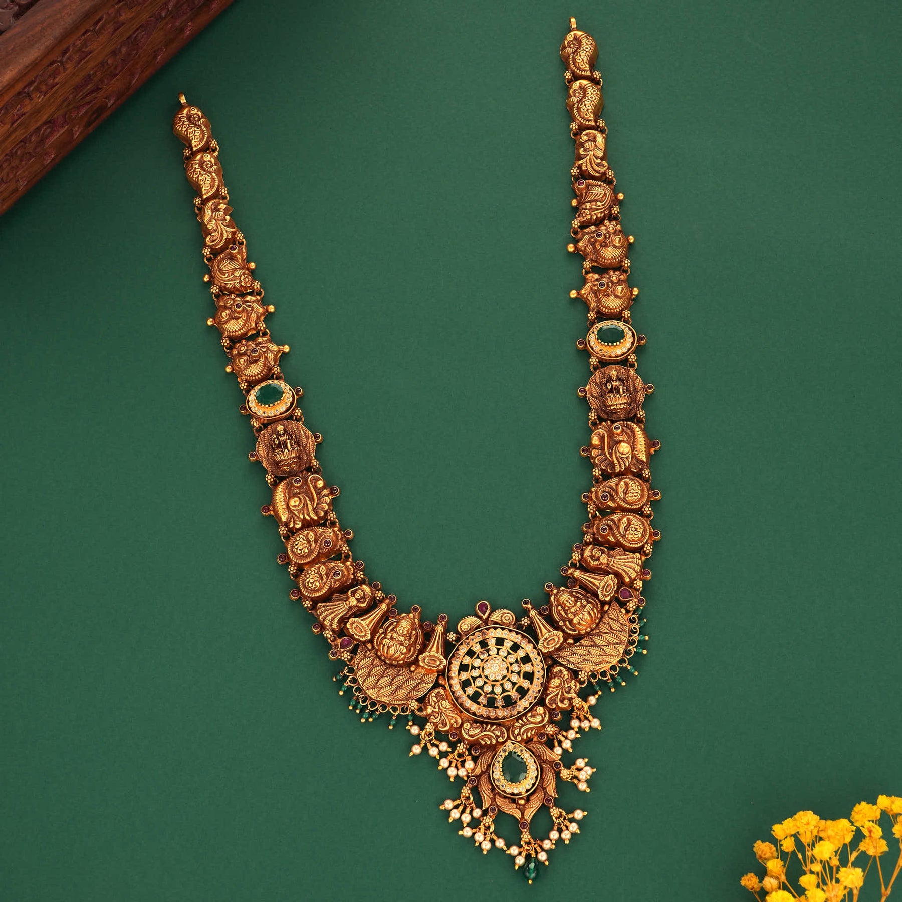 Crafted from 92.5 Silver and 24kt Gold Plated, this Nagas long Necklace shows the beautiful designs in the center with beautiful Unique designs which highlight the presence of the necklace evenmore ..Those hanging Green beads makes this necklace more worth to wear .