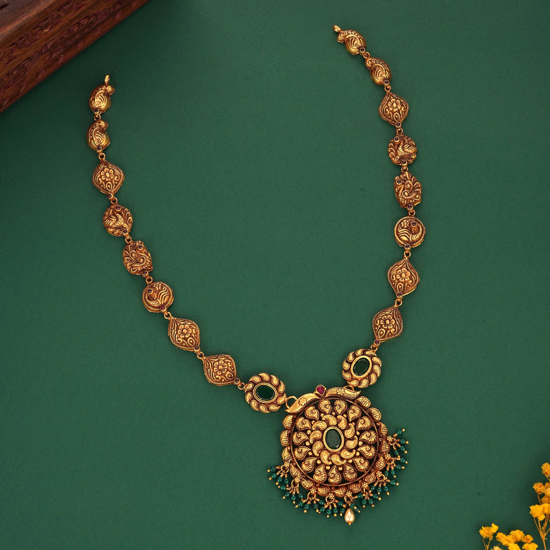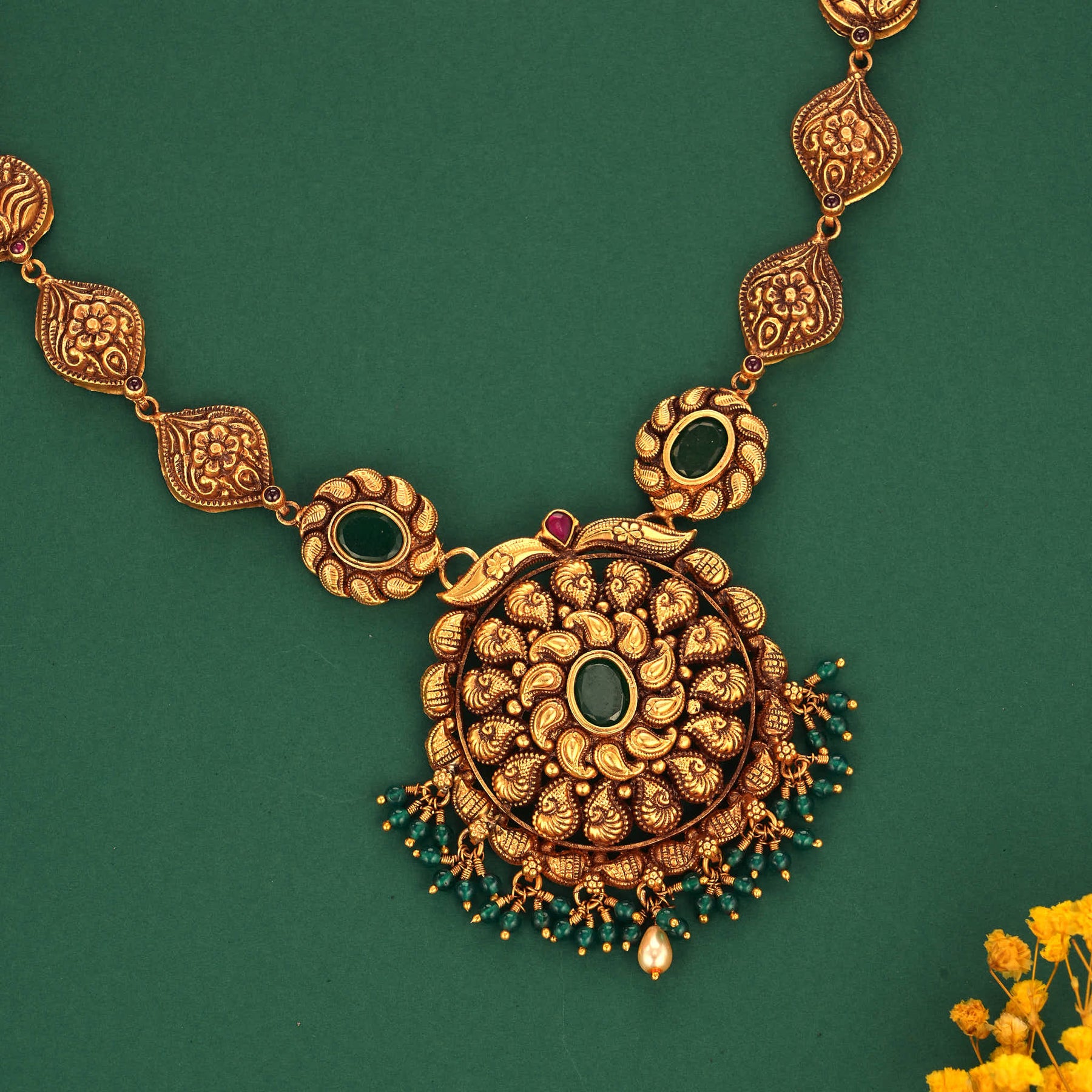 Crafted from 92.5 Silver and 24kt Gold Plated, this Nagas long Necklace shows the beautiful Floral designs in the center with beautiful Unique designs which highlight the presence of the necklace evenmore ..Those hanging Green beads and  Pearl makes this necklace more worth to wear .