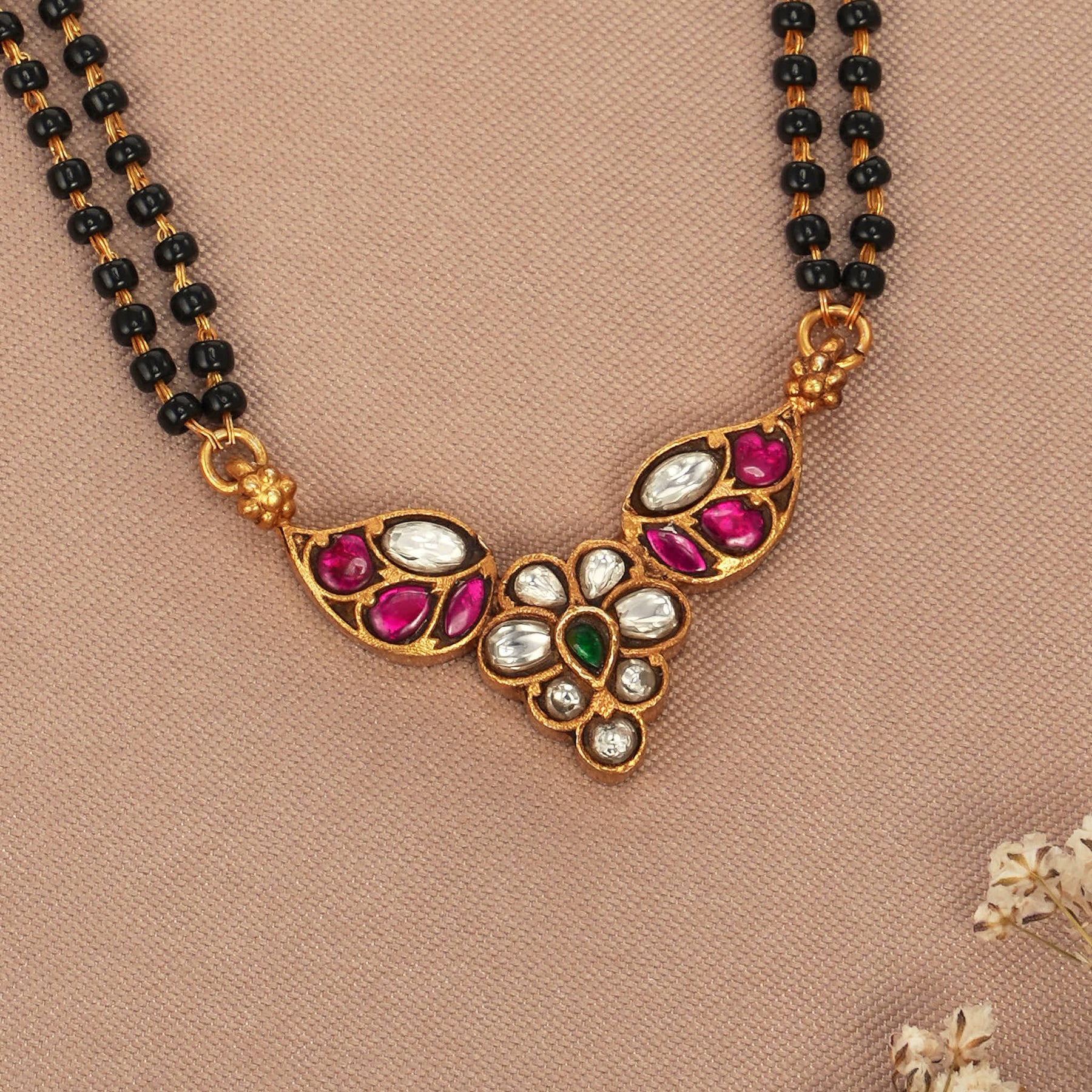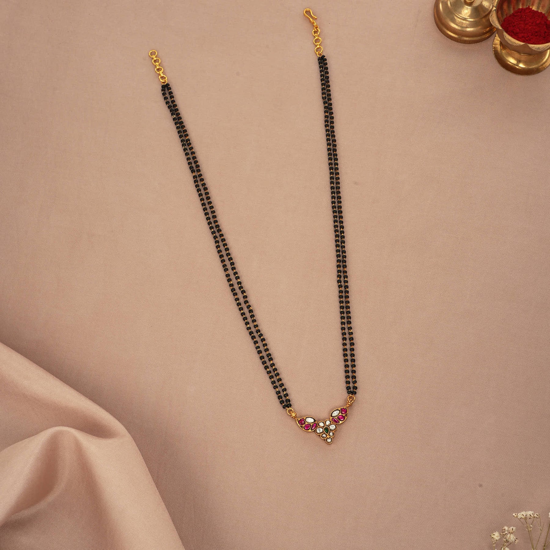 This Chain is perfect for special occasions, featuring 92.5 silver gold plating and a Kundan pendant for a timeless look. Adorned with a double-layer Mangalsutra and kundan stones.