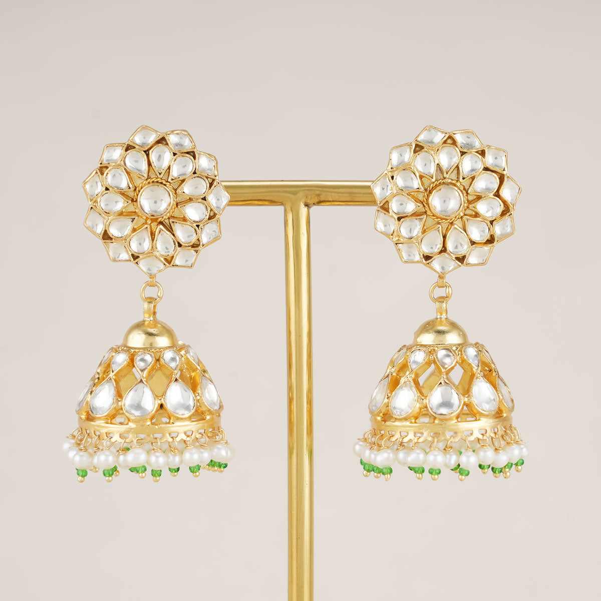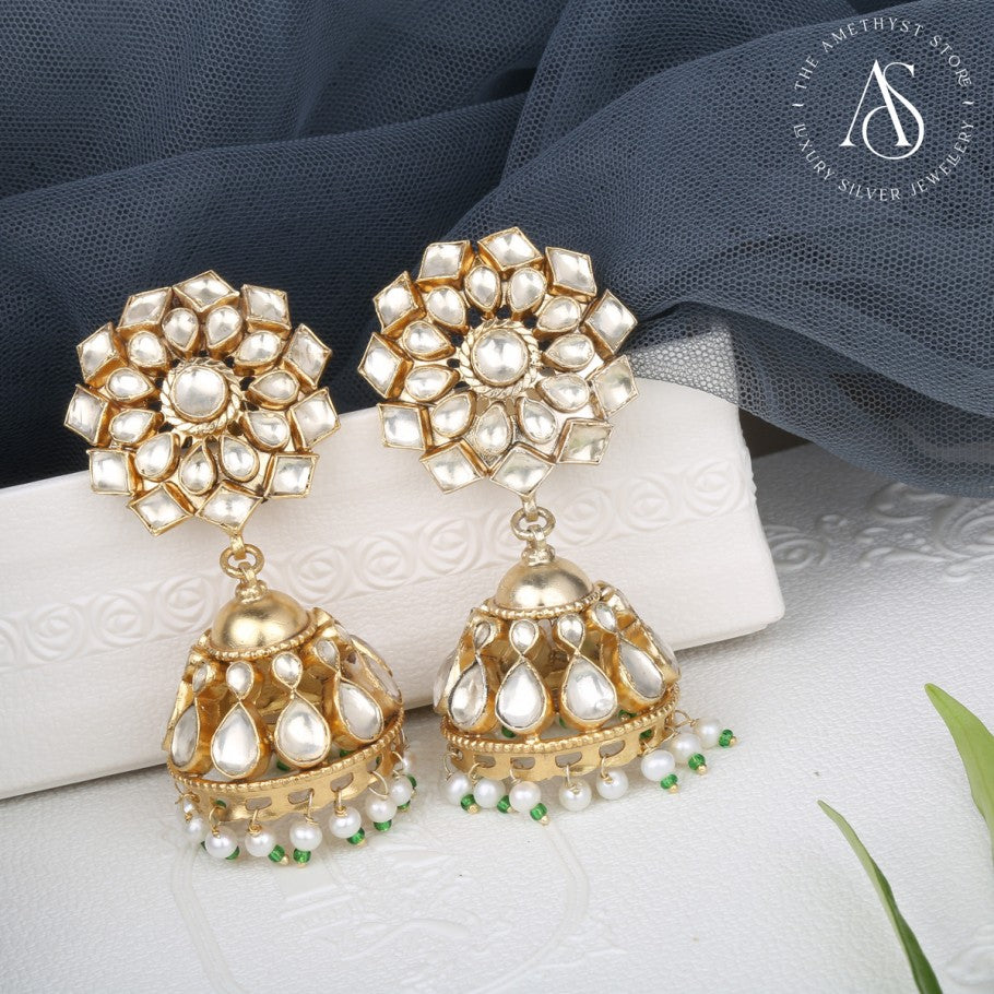 92.5 Silver Gold Plated Jhumkas studded with Kundan stones.