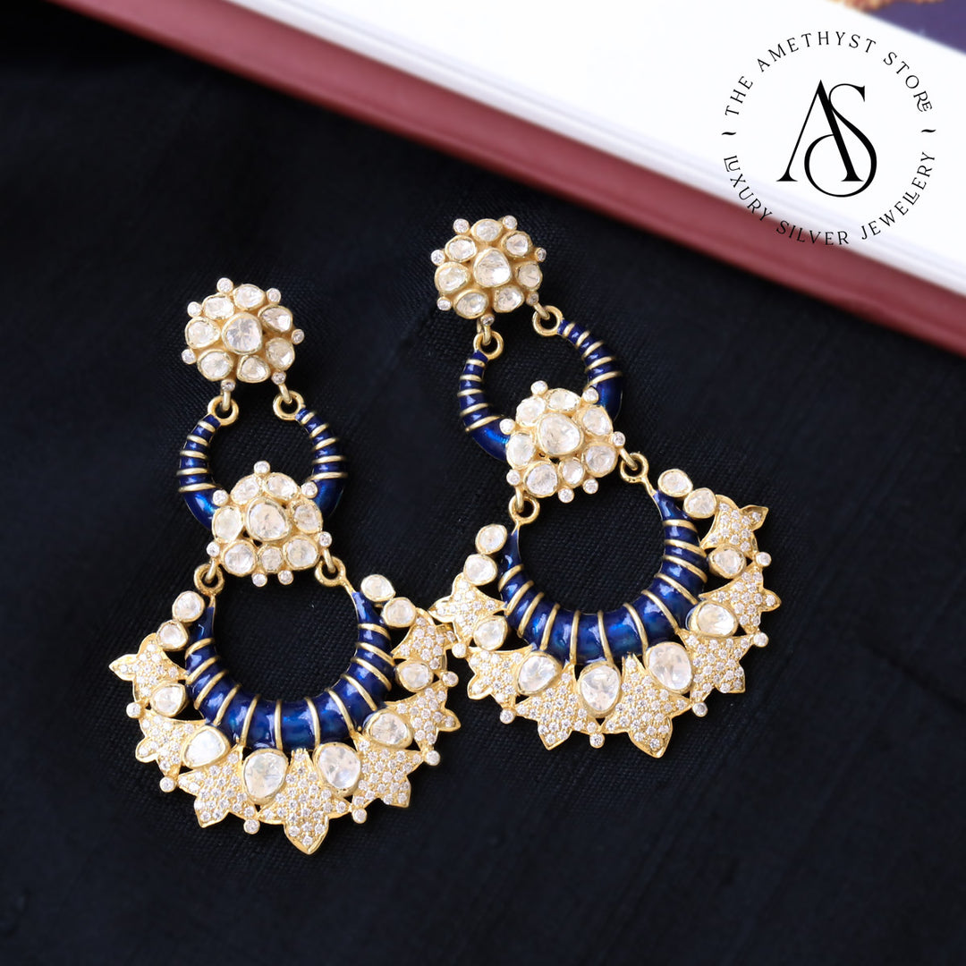 This 92.5 Silver, 24 kt gold-plated stylish Earring is studded with semi-precious Kundan stones to make a stunning statement. Perfect for both formal and casual occasions.