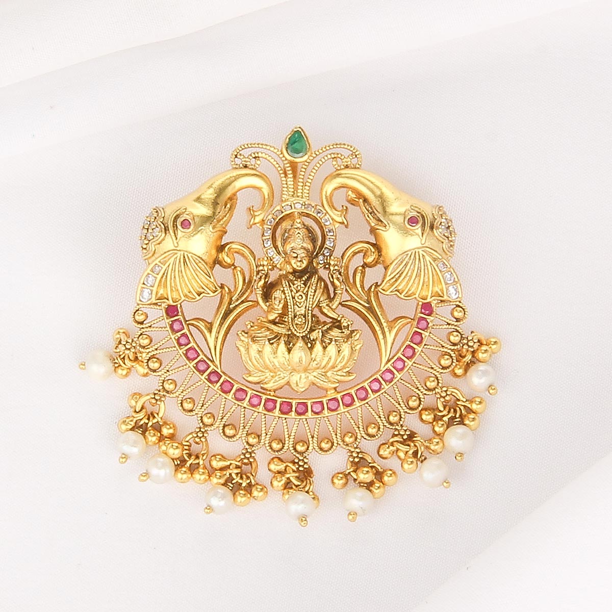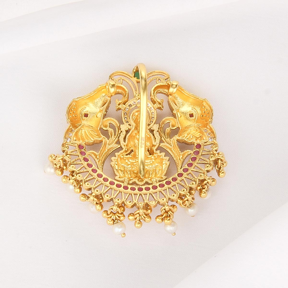 This collection of Nagas Nakshi pendants is handcrafted in 92.5 silver and plated with 24kt gold. It is finely detailed with semi-precious stones, adding a subtle sparkle and perfect finishing touch.