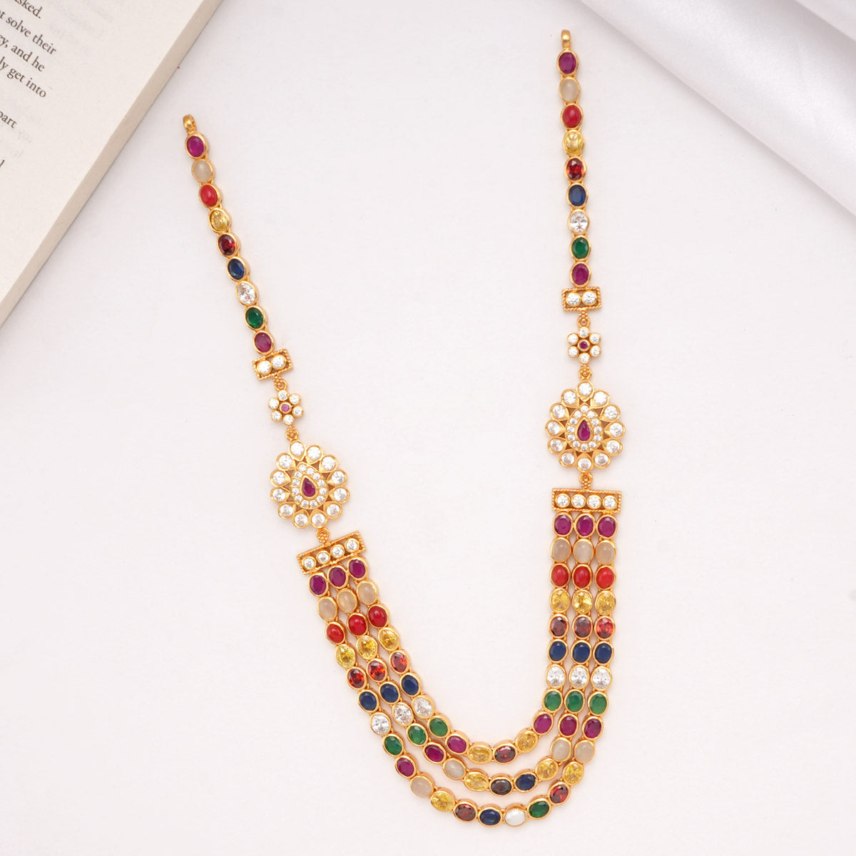 This 92.5 Silver, 24 kt gold-plated, stylish Necklace is studded with semi-precious stones to make a stunning statement. Perfect for any special occasion.