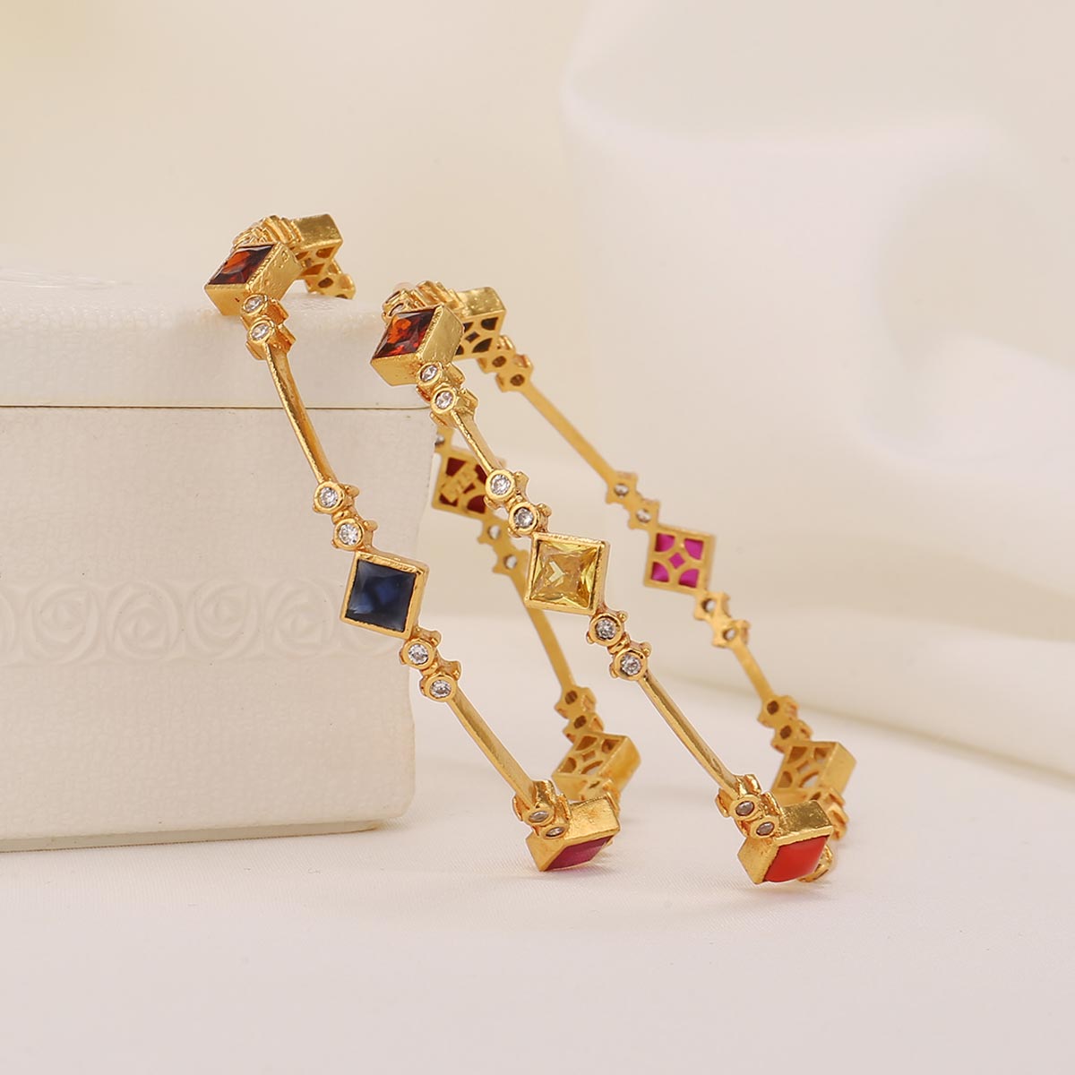 This 92.5 Silver, 24 kt gold-plated stylish Bangles is studded with semi-precious stones to make a stunning statement. Perfect for both formal and casual occasions.