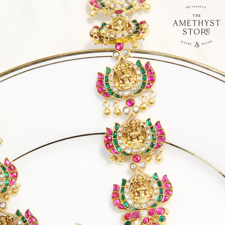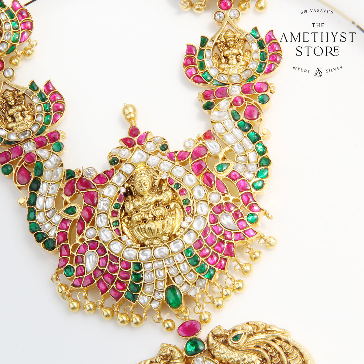 This 92.5 Silver, 24 kt Gold-Plated Necklace is adorned with Semi-precious Kundan Stones for a luxurious aesthetic.