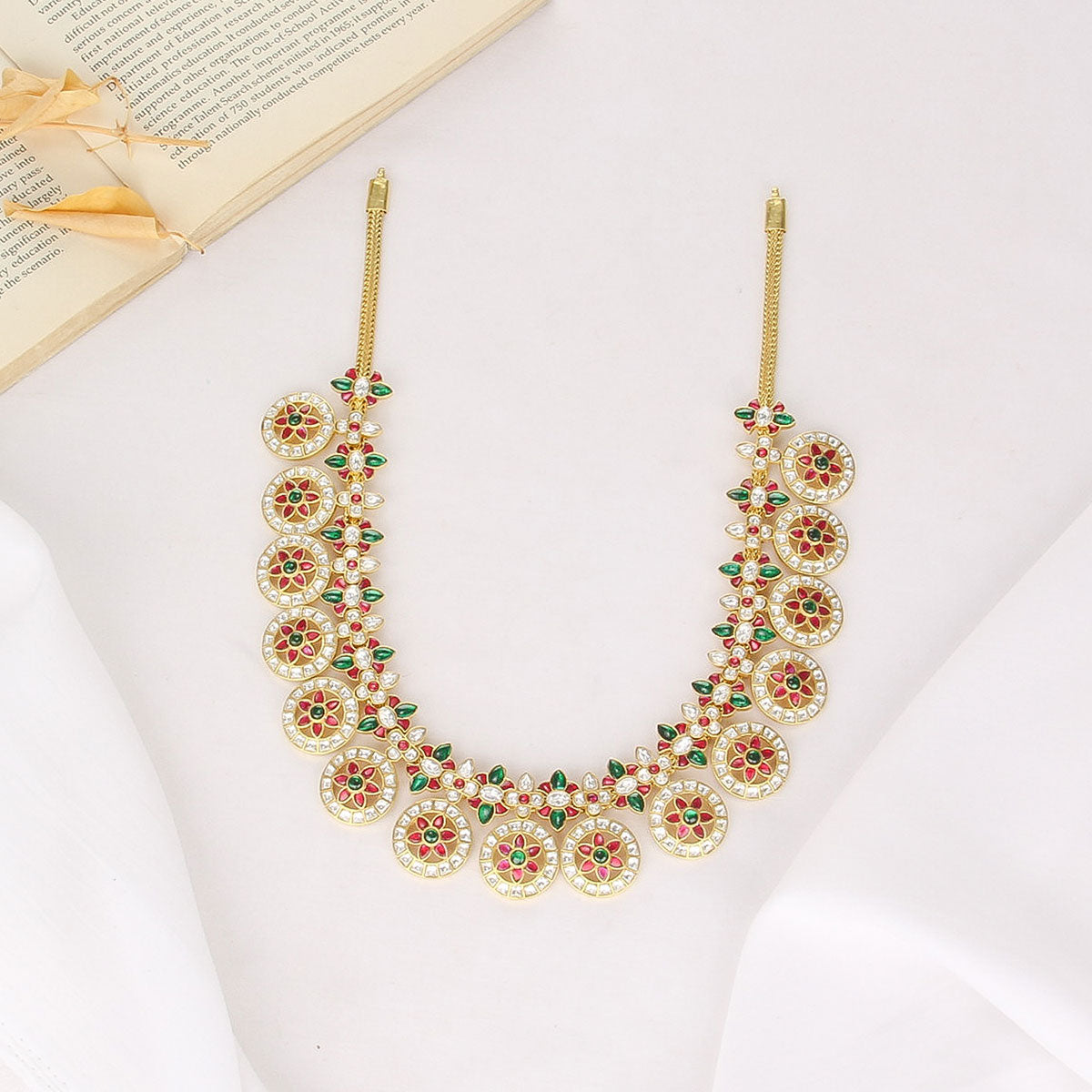 This 92.5 Silver, 24 kt Gold-Plated  Necklace is adorned with Semi-precious Kundan Stones for a luxurious aesthetic.
