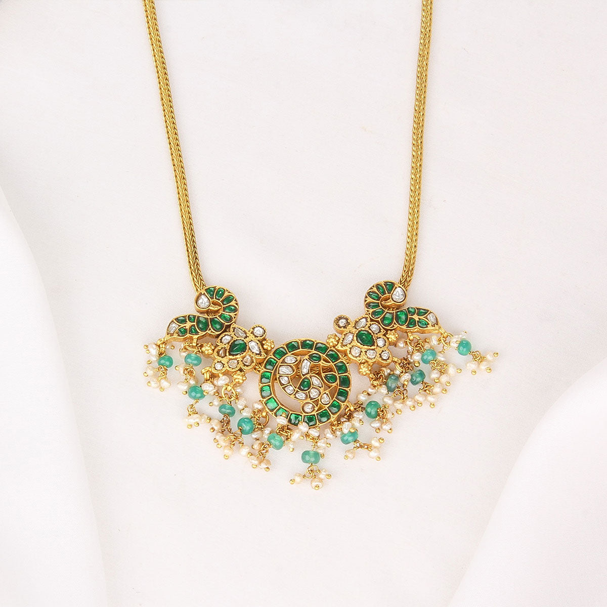 This 92.5 Silver, 24 kt Gold-Plated  Necklace is adorned with Semi-precious Kundan Stones for a luxurious aesthetic.
