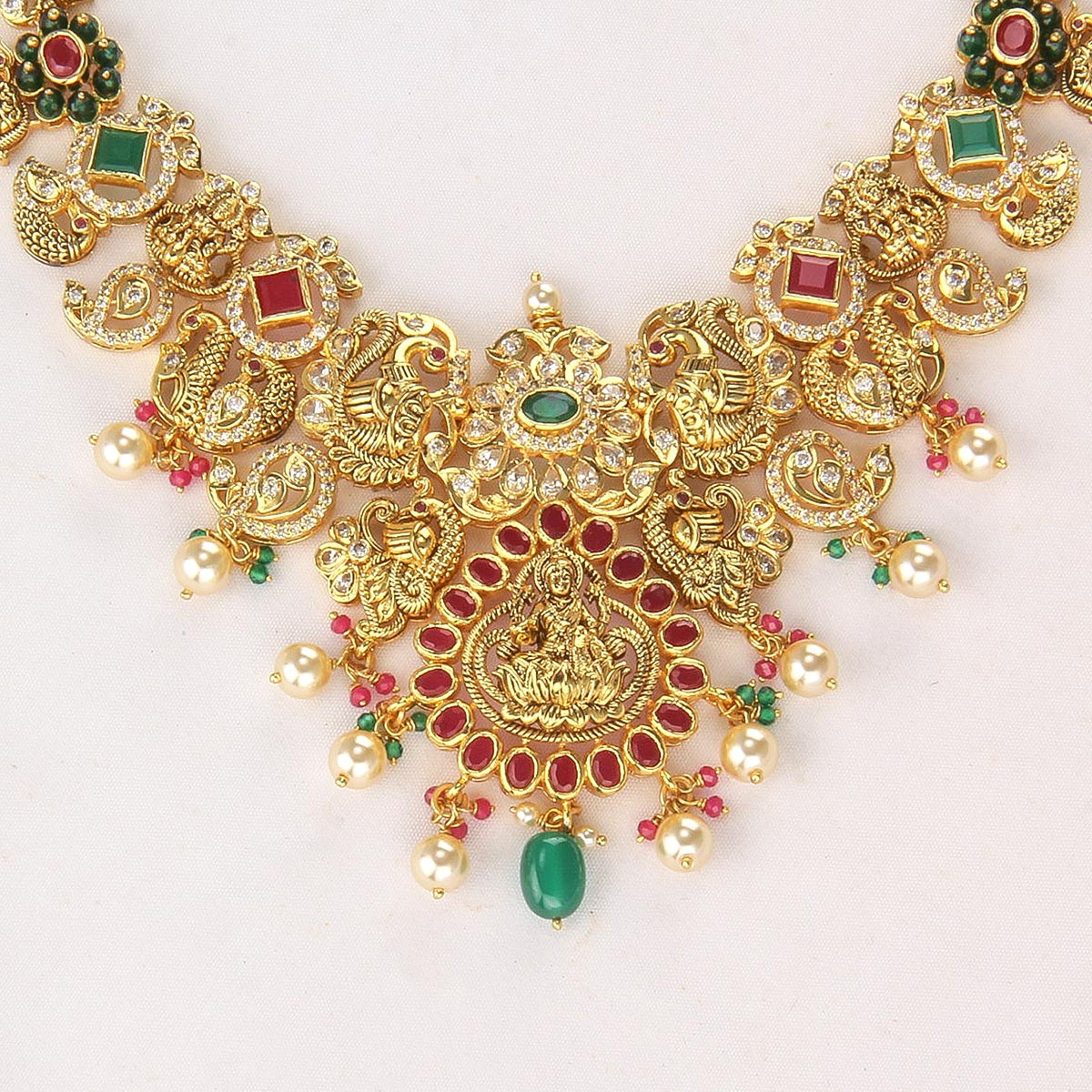 This 92.5 Silver, 24 kt Gold-Plated Short Necklace Set is adorned with Semi-precious Stones for a luxurious aesthetic.