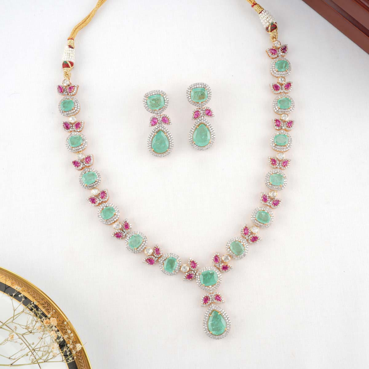 92.5 Silver, Victorian Necklace set studded with Gem Stones and Pearl Beads.