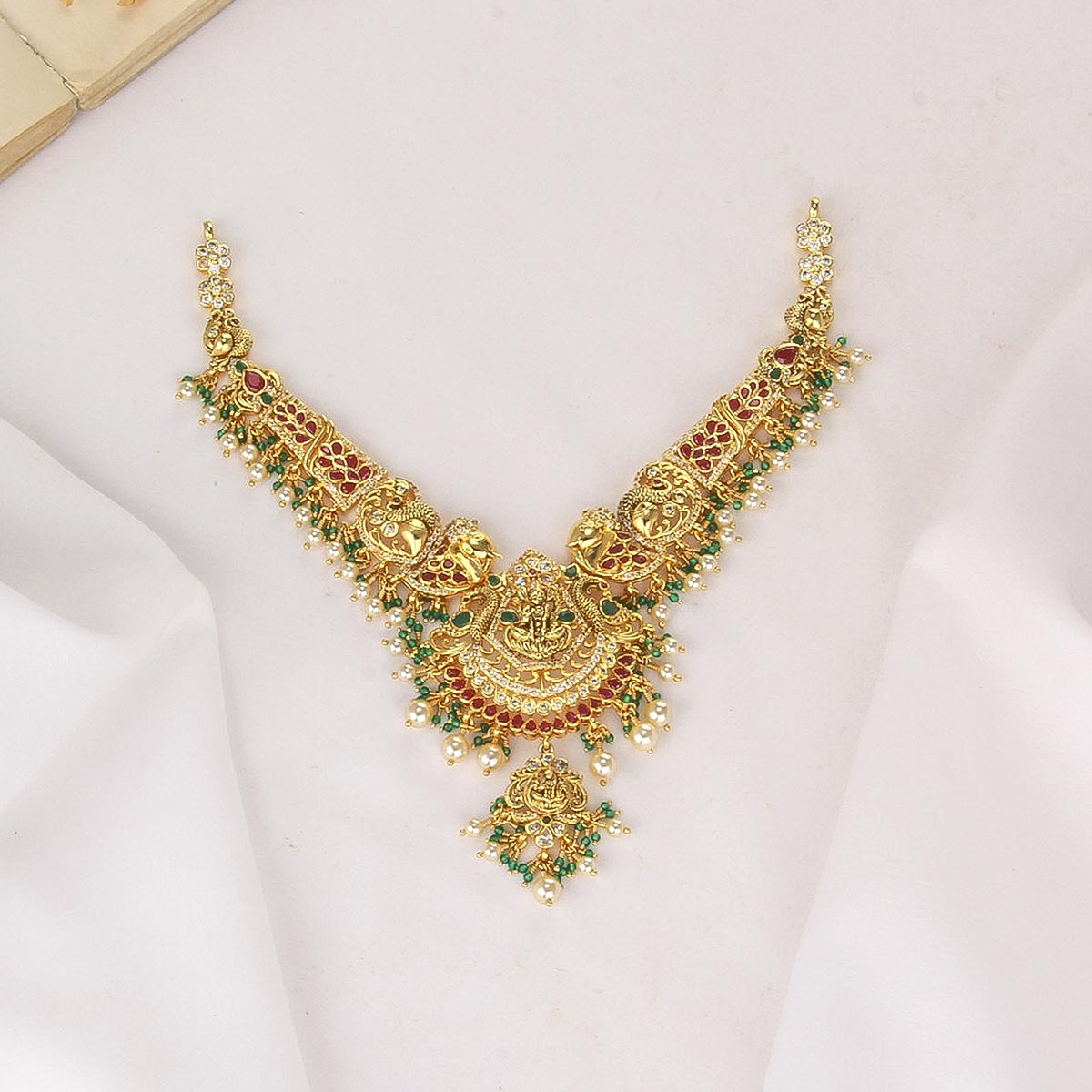 This 92.5 Silver, 24 kt Gold-Plated Short Necklace is adorned with Semi-precious Stones for a luxurious aesthetic.