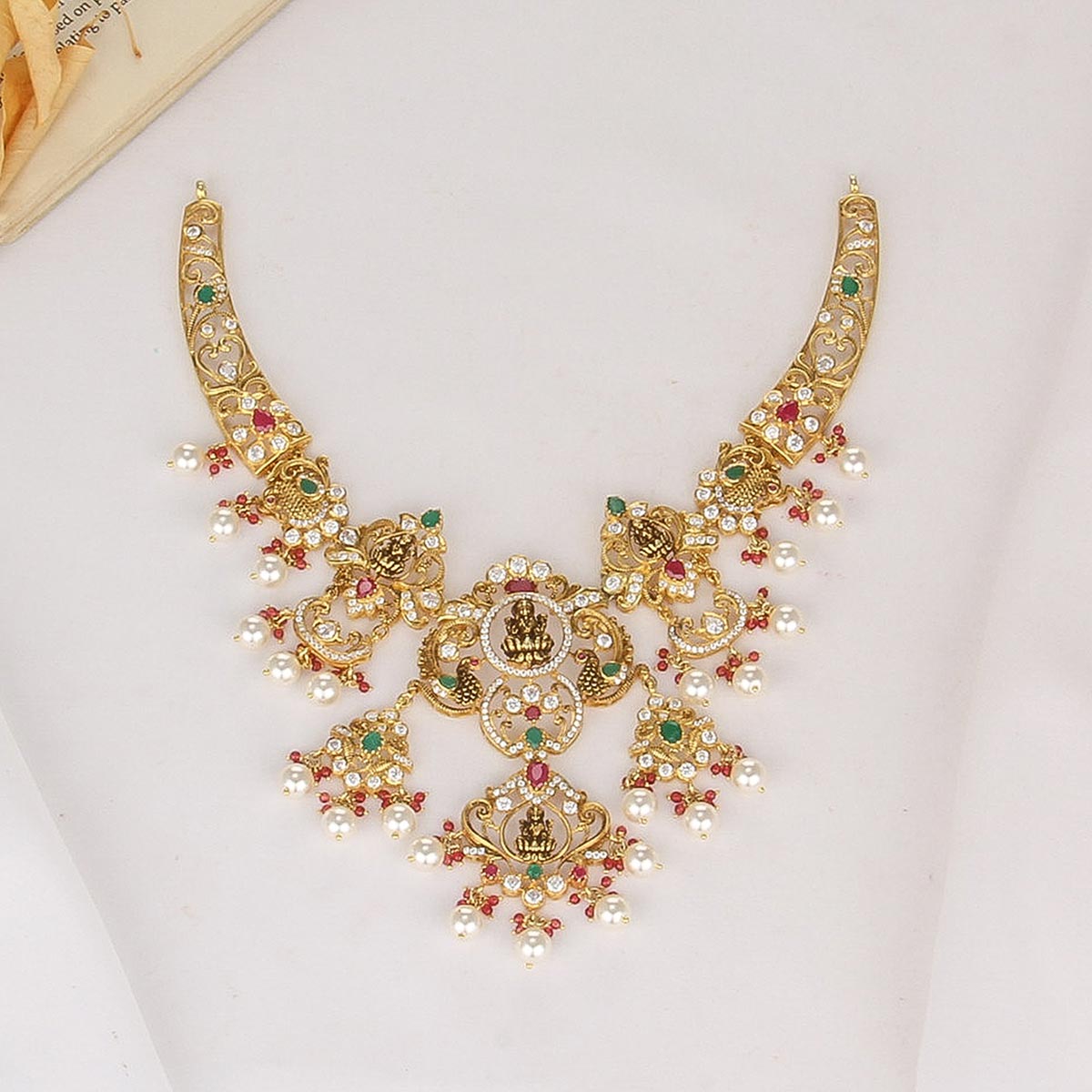 This 92.5 Silver, 24 kt Gold-Plated Short Necklace is adorned with Semi-precious Stones for a luxurious aesthetic.