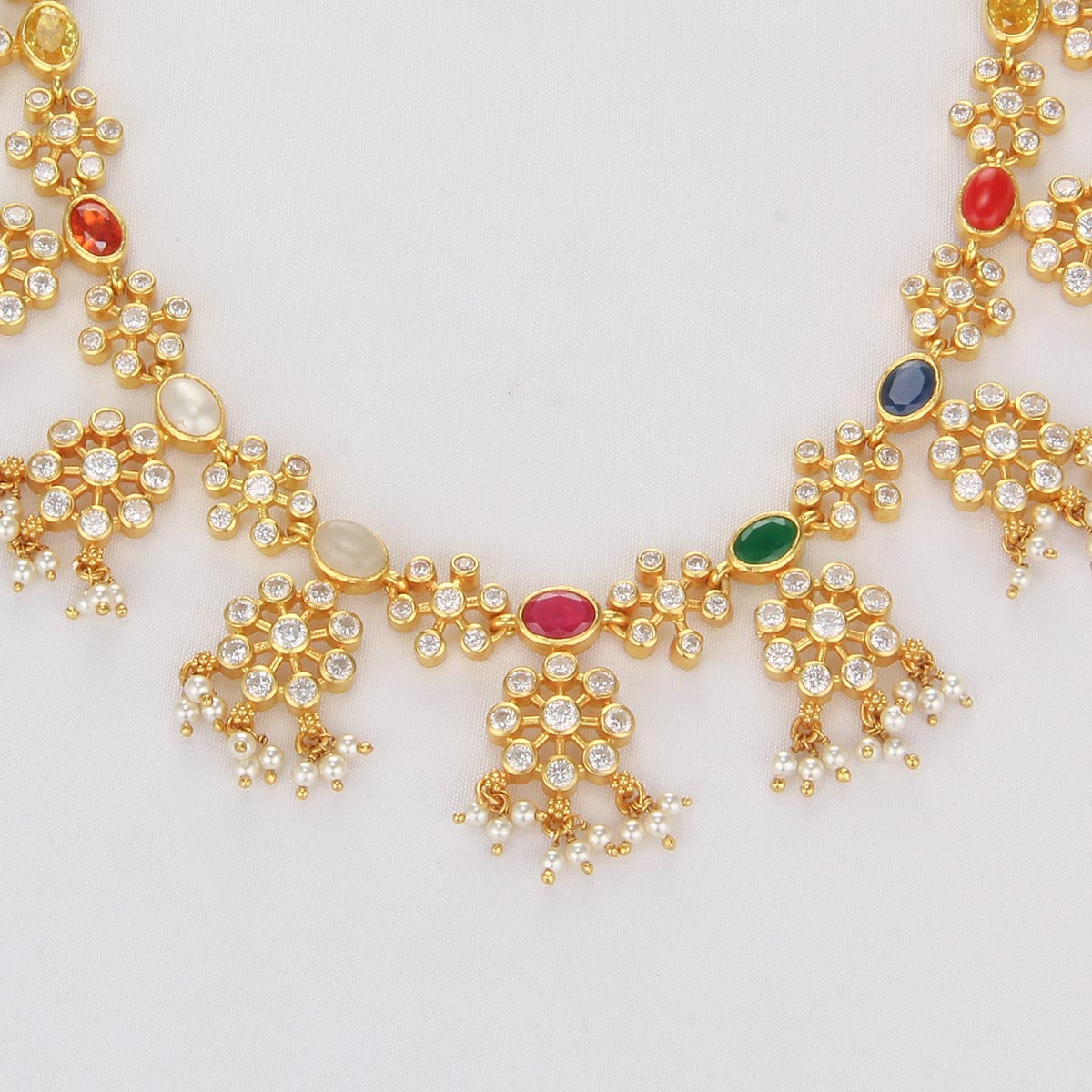 This necklace is crafted from 92.5 Silver and features 24-karat gold plating as well as semiprecious stones.