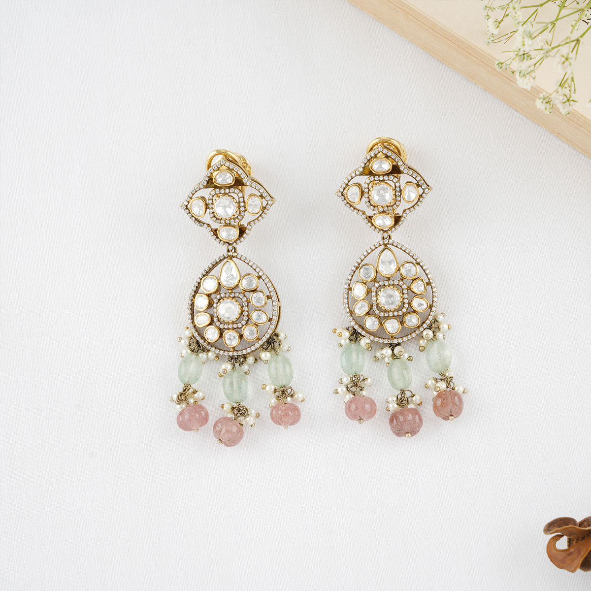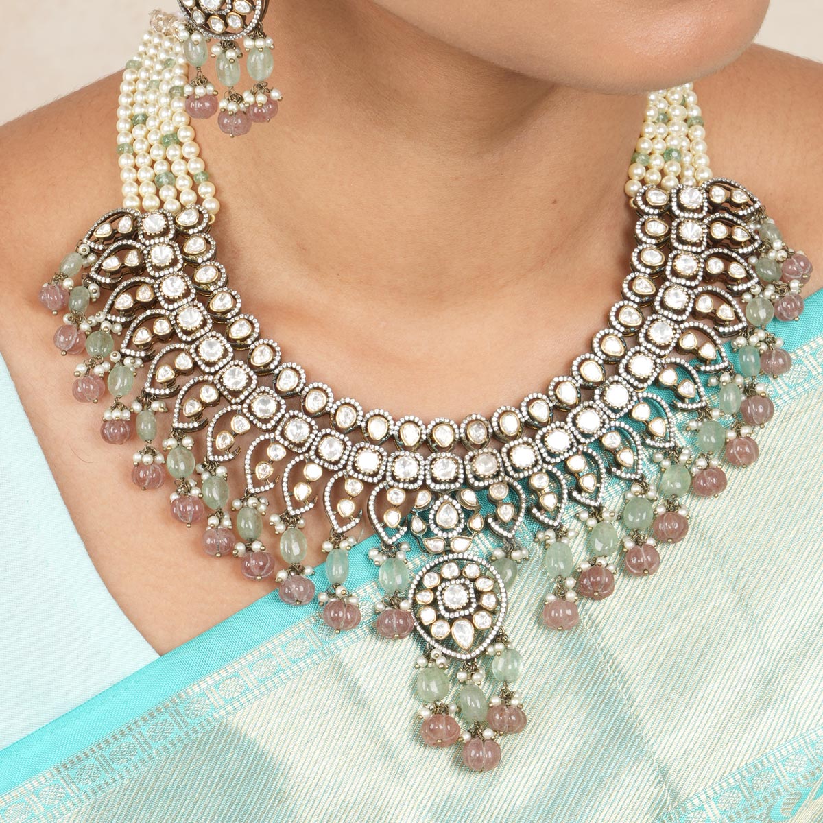 92.5 Silver, Victorian Necklace set studded with Gem Stones and Pearl Beads.