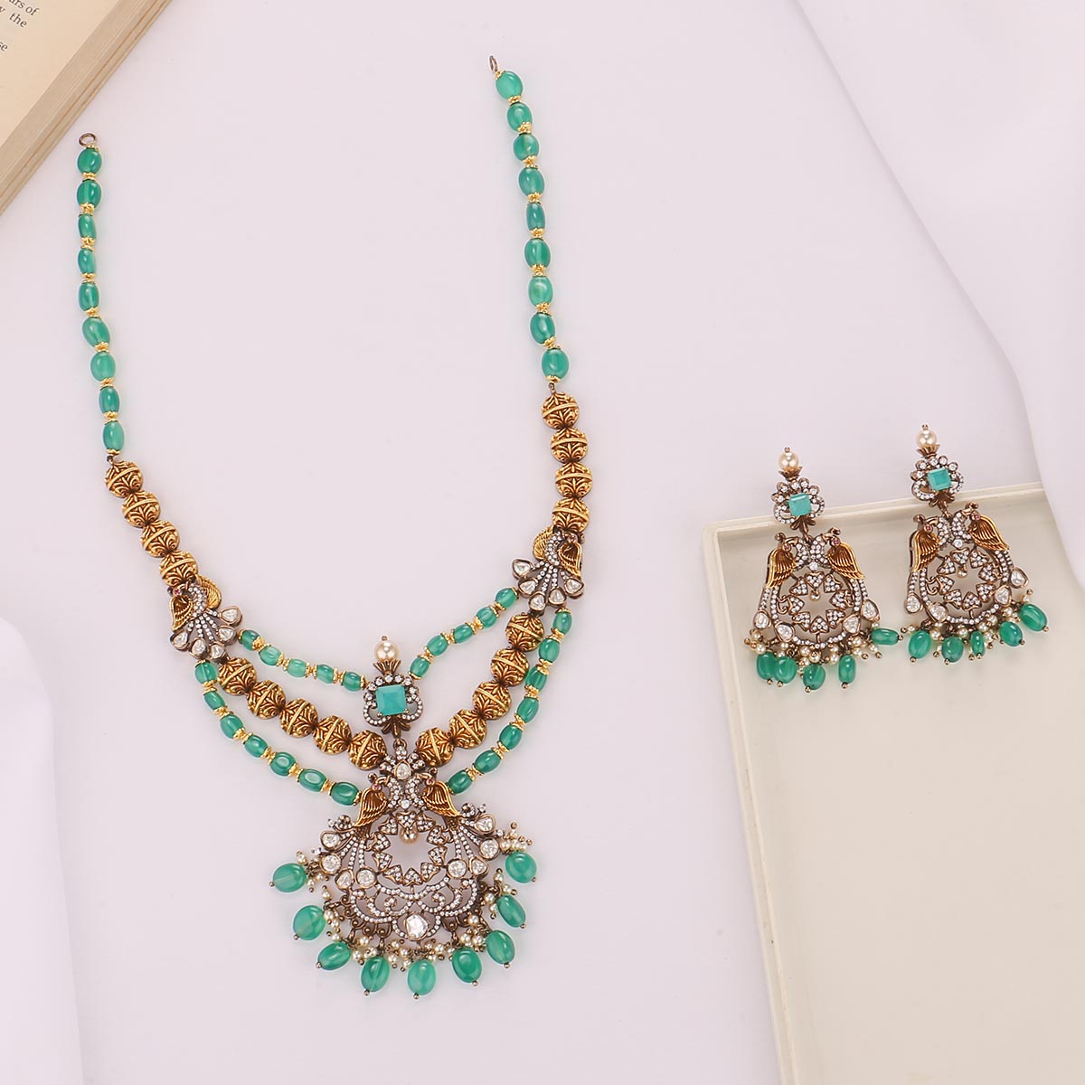 92.5 Silver, Victorian Necklace set studded with Gem Stones and Pearl Beads.