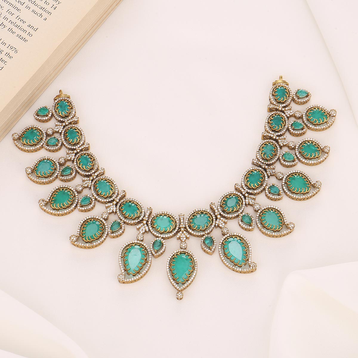 92.5 Silver, Victorian Necklace set studded with Gem Stones and Pearl Beads.