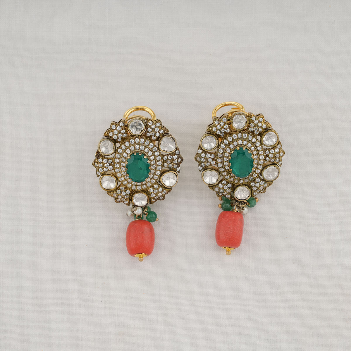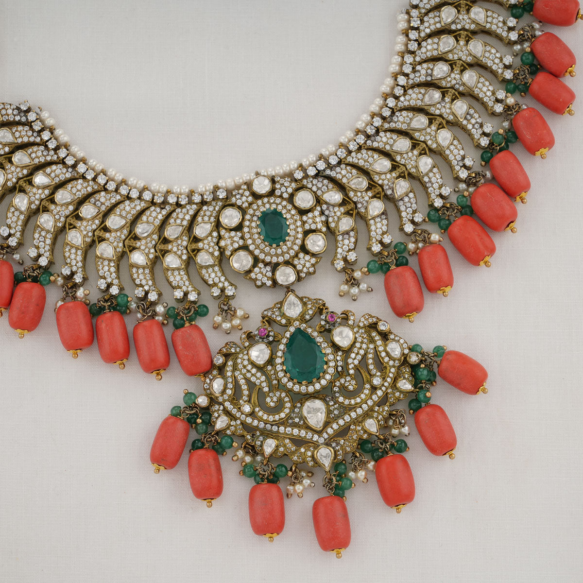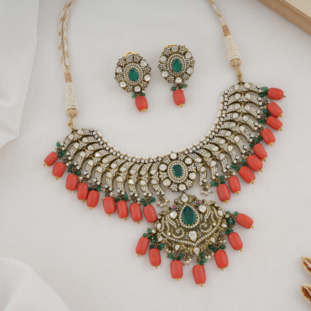 92.5 Silver, Victorian Necklace set studded with Gem Stones and Pearl Beads.