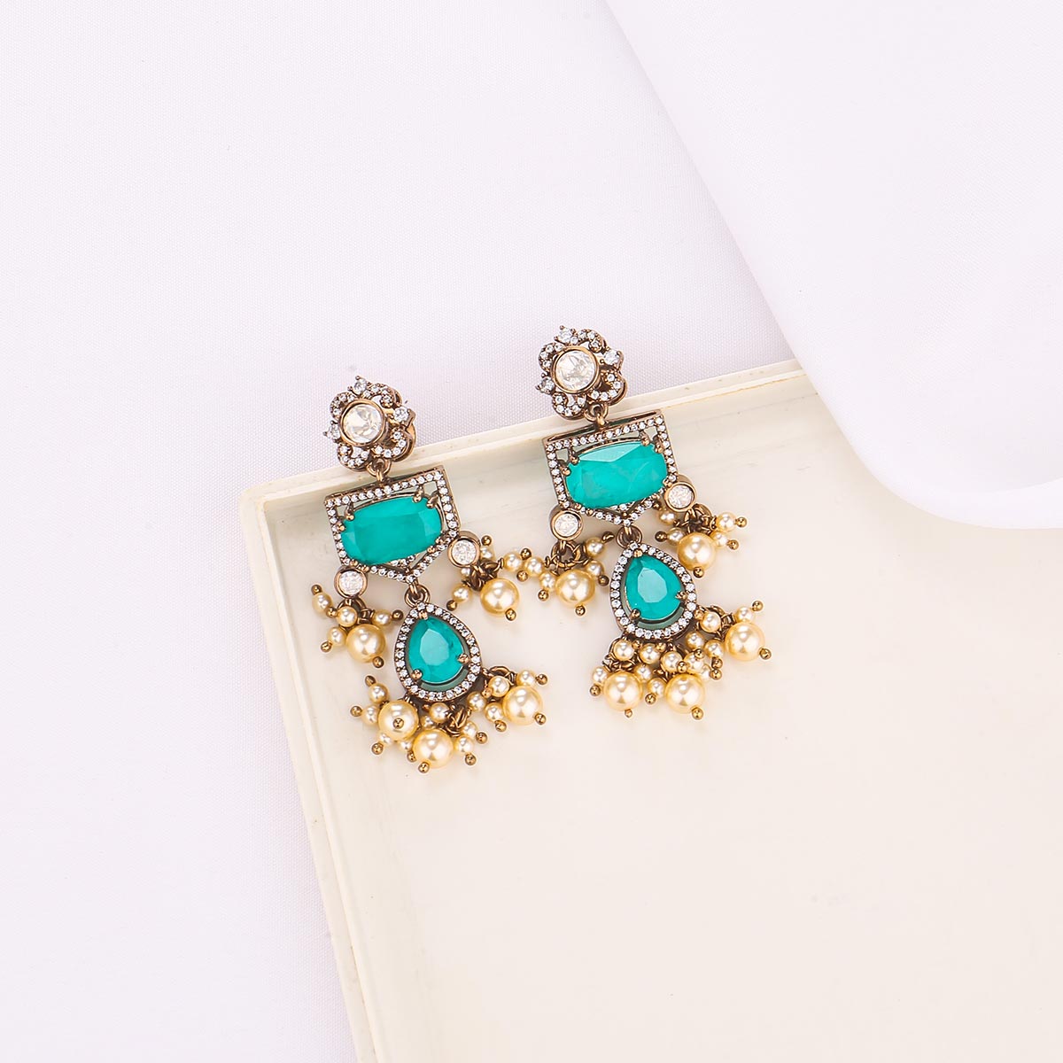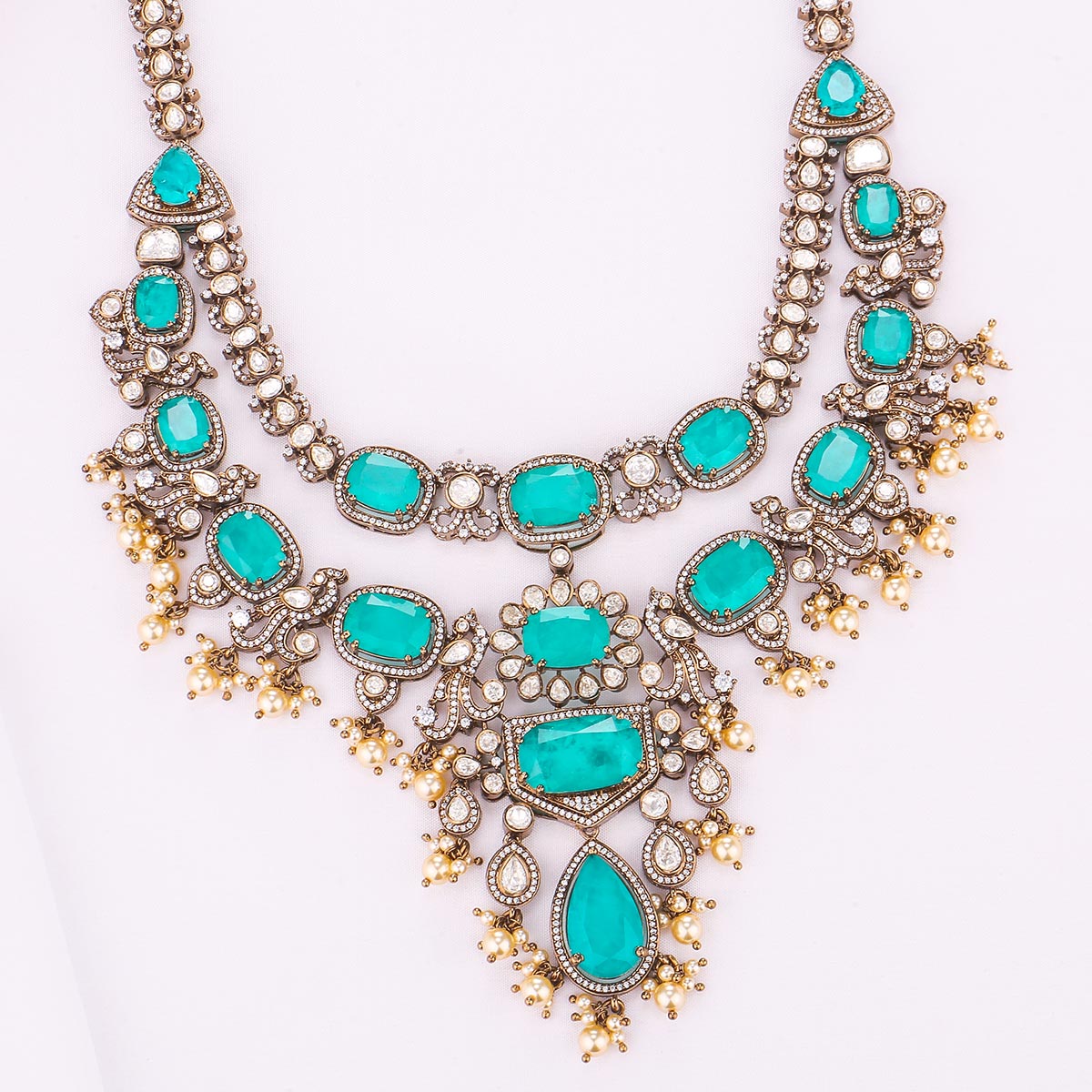 92.5 Silver, Victorian Necklace set studded with Gem Stones and Pearl Beads.