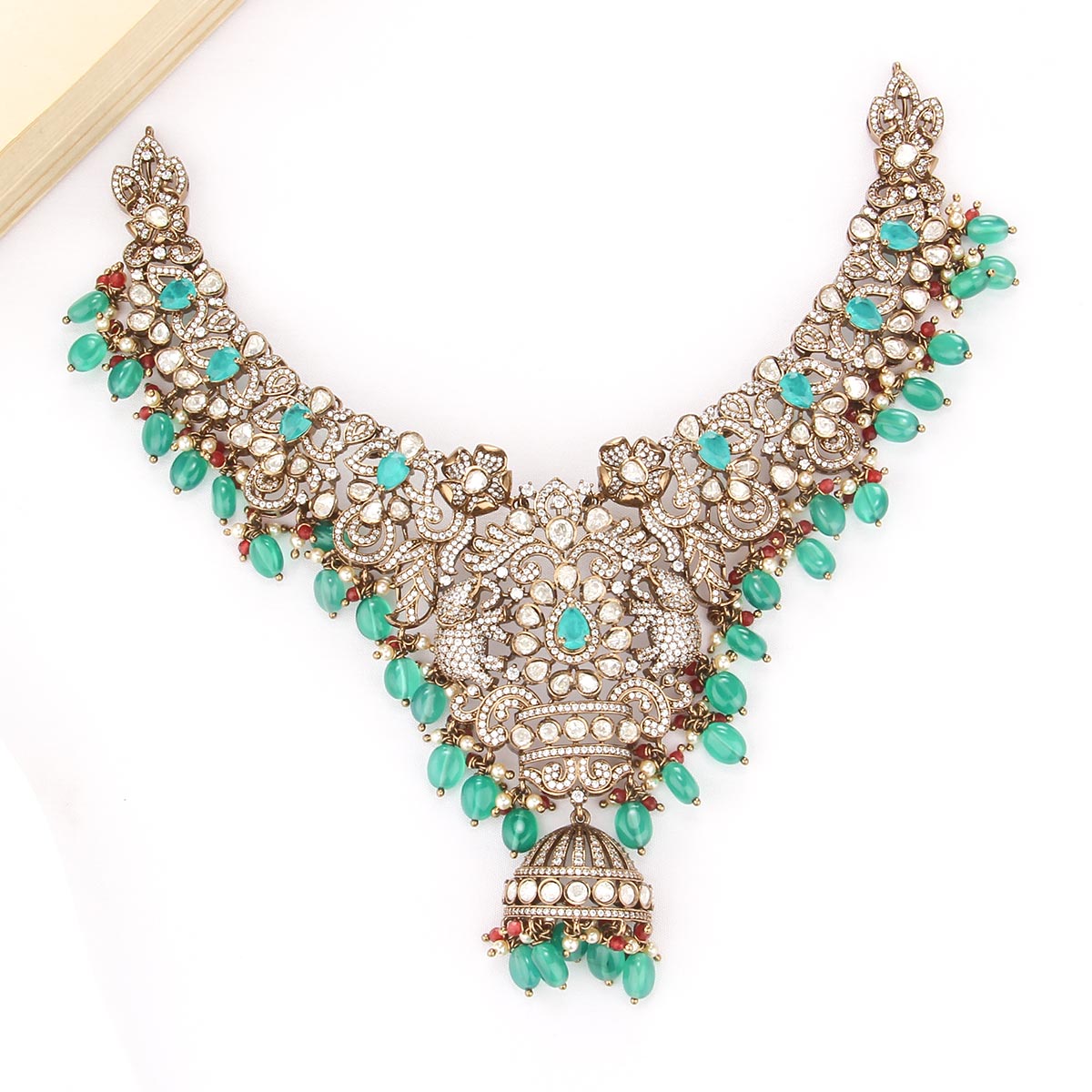 92.5 Silver, Victorian Necklace set studded with Gem Stones and Beads.
