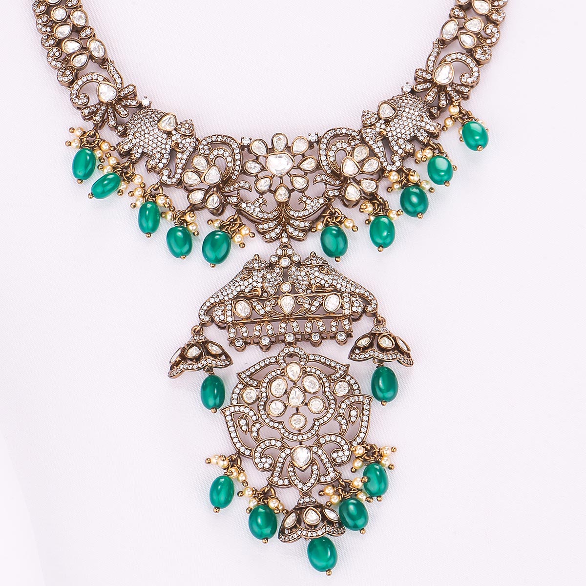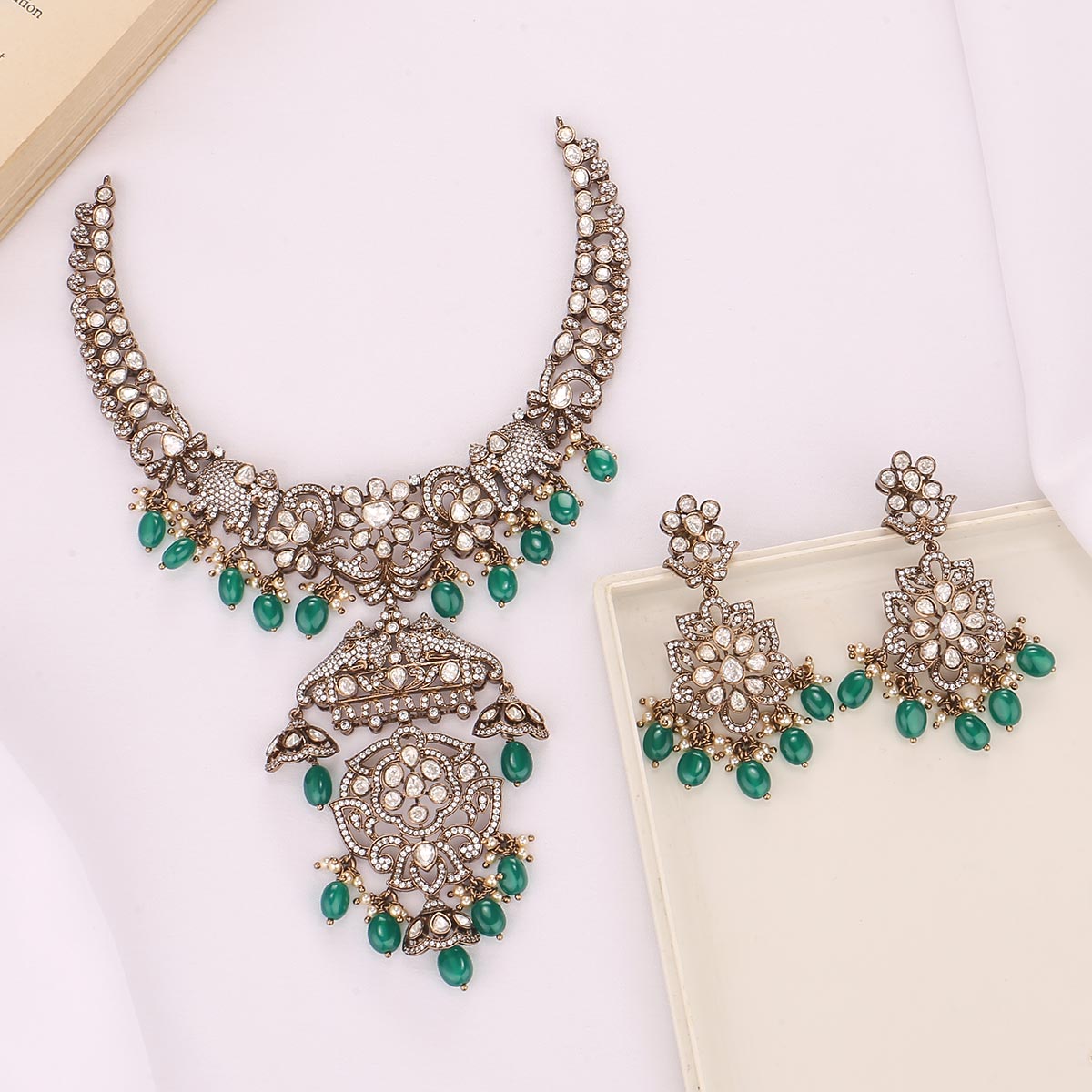 92.5 Silver, Victorian Necklace set studded with Gem Stones and Pearl Beads.