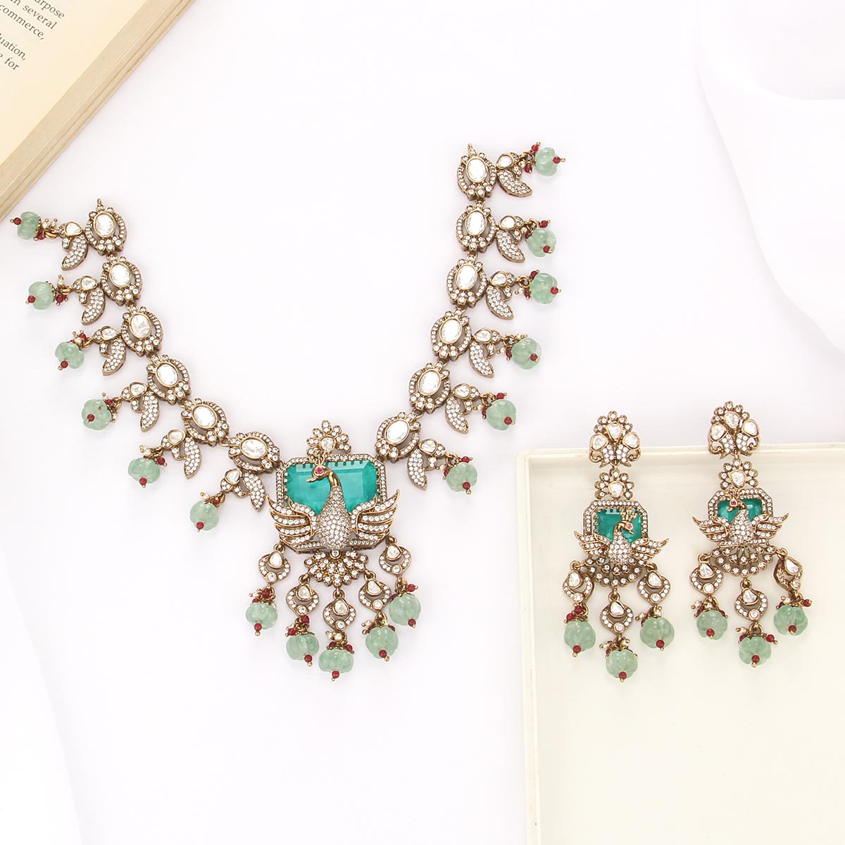 92.5 Silver, Victorian Necklace set studded with Gem Stones and Beads.