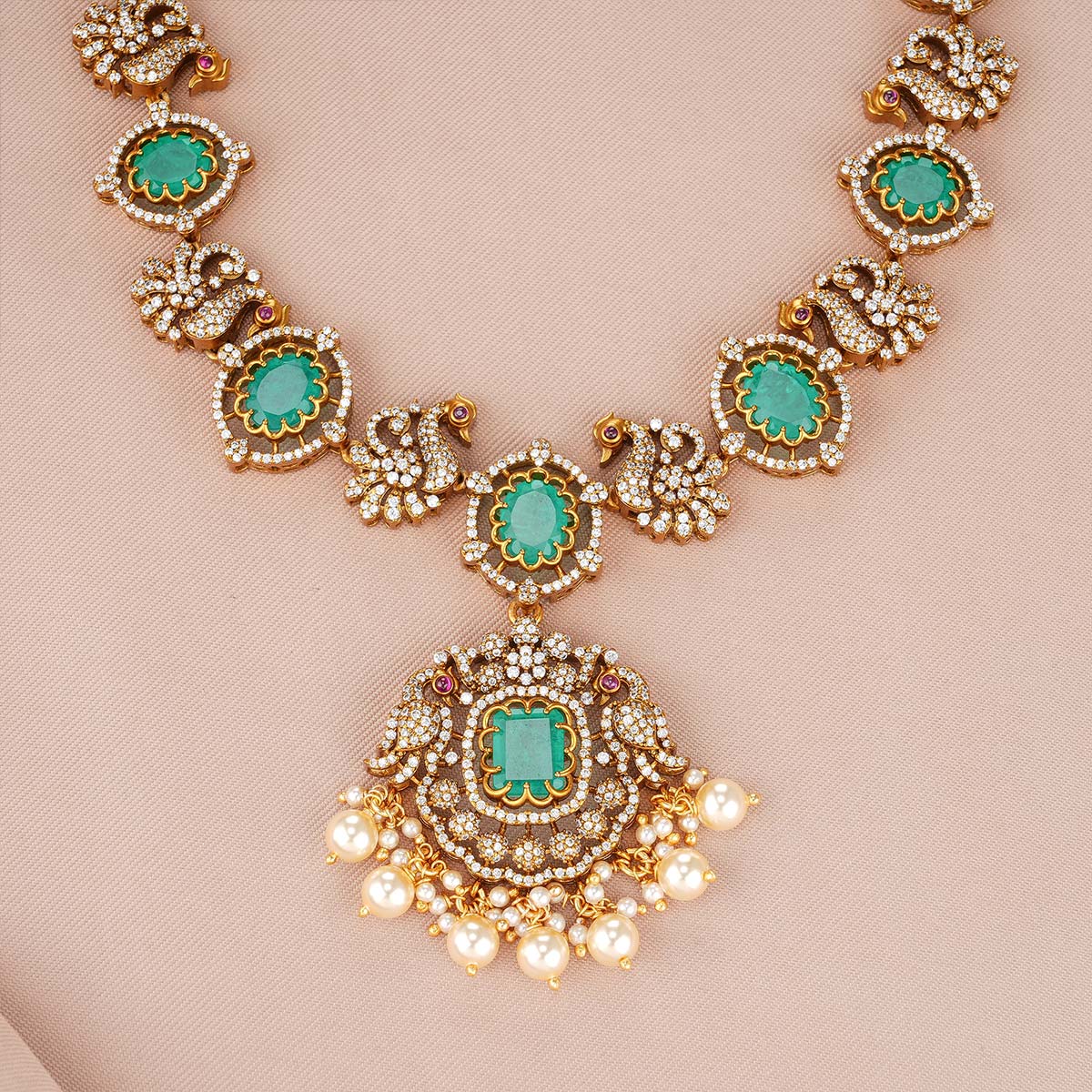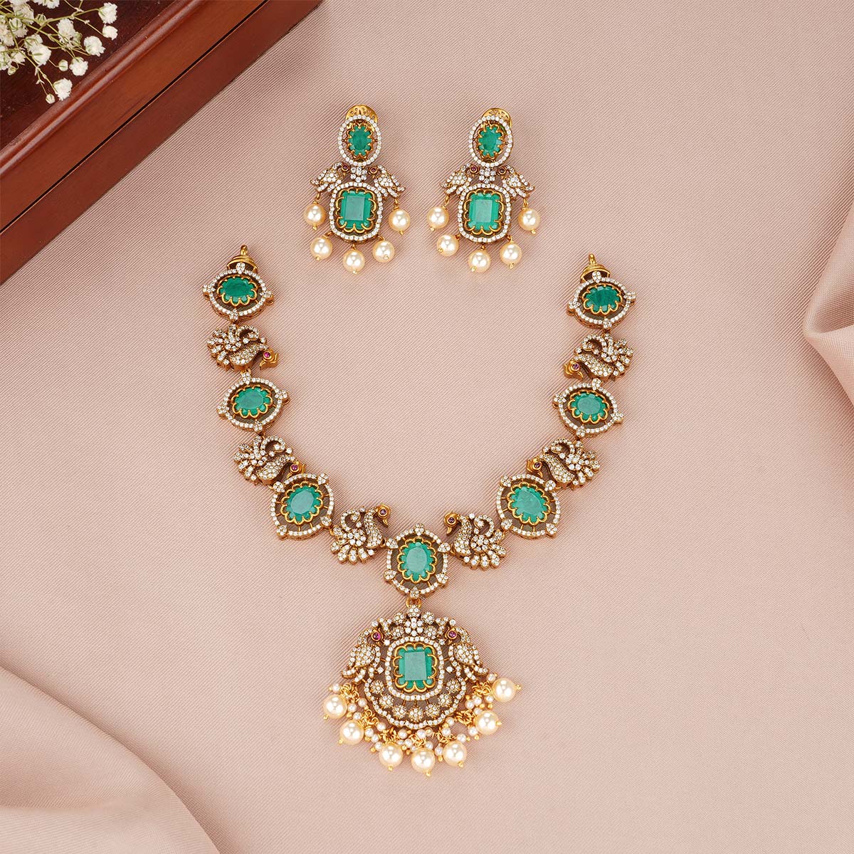 92.5 Silver, Victorian Necklace set studded with Gem Stones and Pearl Beads.