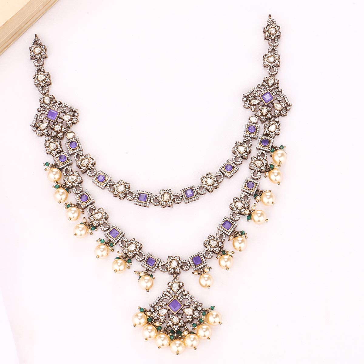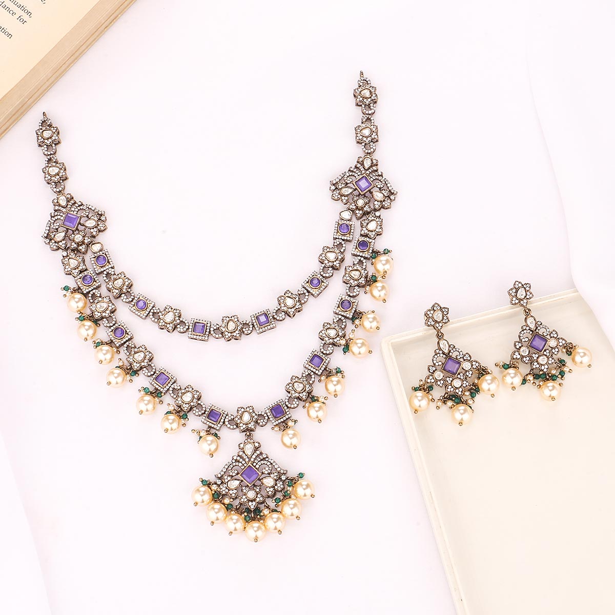 92.5 Silver, Victorian Necklace set studded with Gem Stones and Pearl Beads.