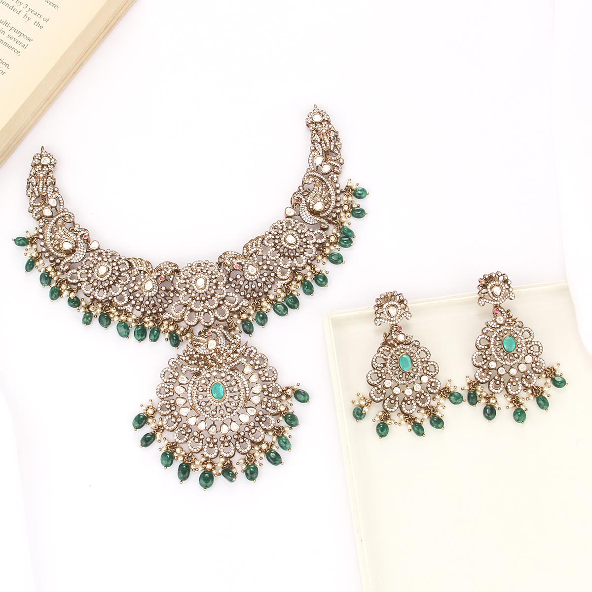 92.5 Silver, Victorian Necklace set studded with Gem Stones and Pearl Beads.