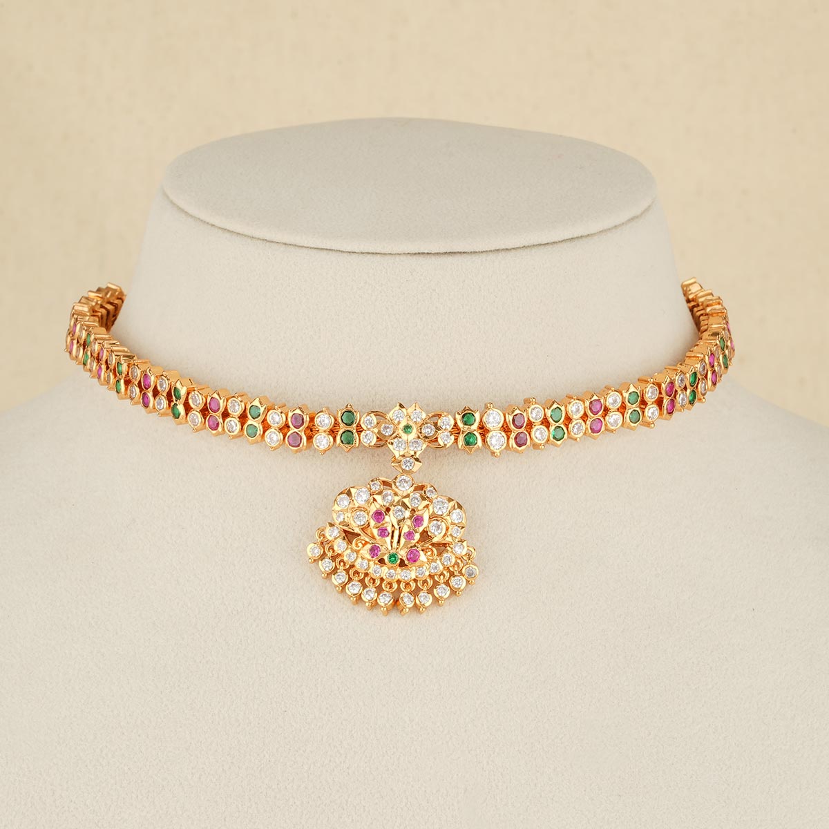 This 92.5 Silver, 24 kt gold-plated stylish Attigai Necklace is studded with semi-precious stones to make a stunning statement. Ideal for any significant event.