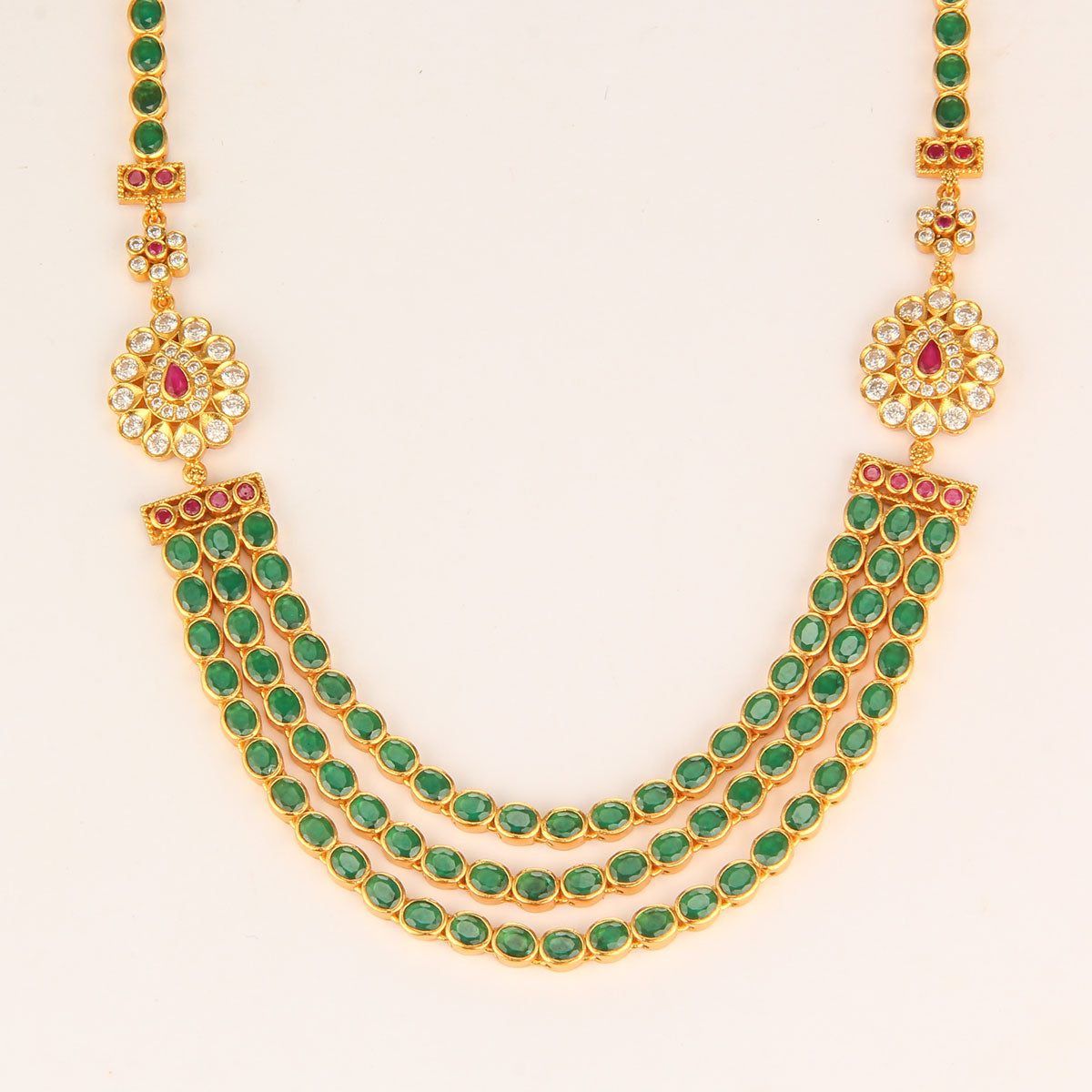 This 92.5 Silver, 24 kt gold-plated, stylish Necklace is studded with semi-precious stones to make a stunning statement. Perfect for any special occasion.