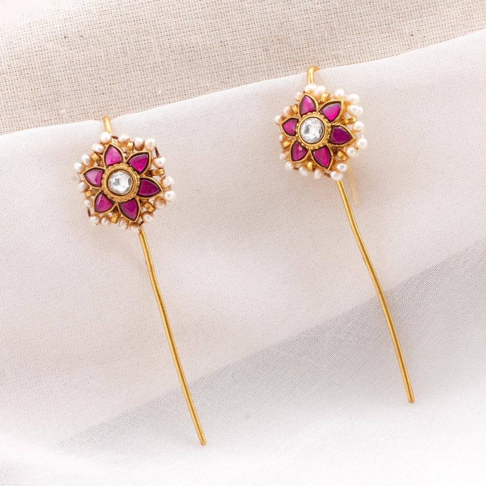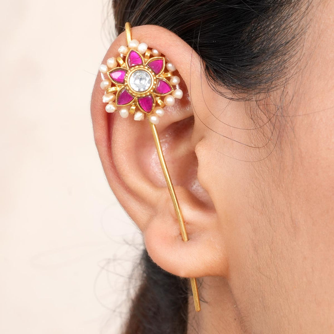 This 92.5 Silver, 24 kt Gold-Plated Earring is adorned with Semi-precious Kundan Stones for a luxurious aesthetic.