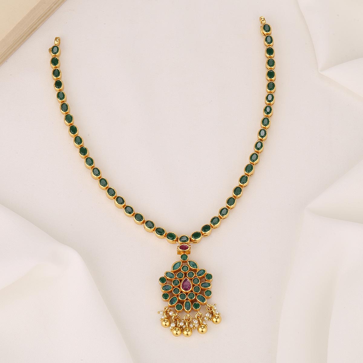 This 92.5 Silver, 24 kt gold-plated, stylish Necklace is studded with semi-precious stones to make a stunning statement. Perfect for any special occasion.