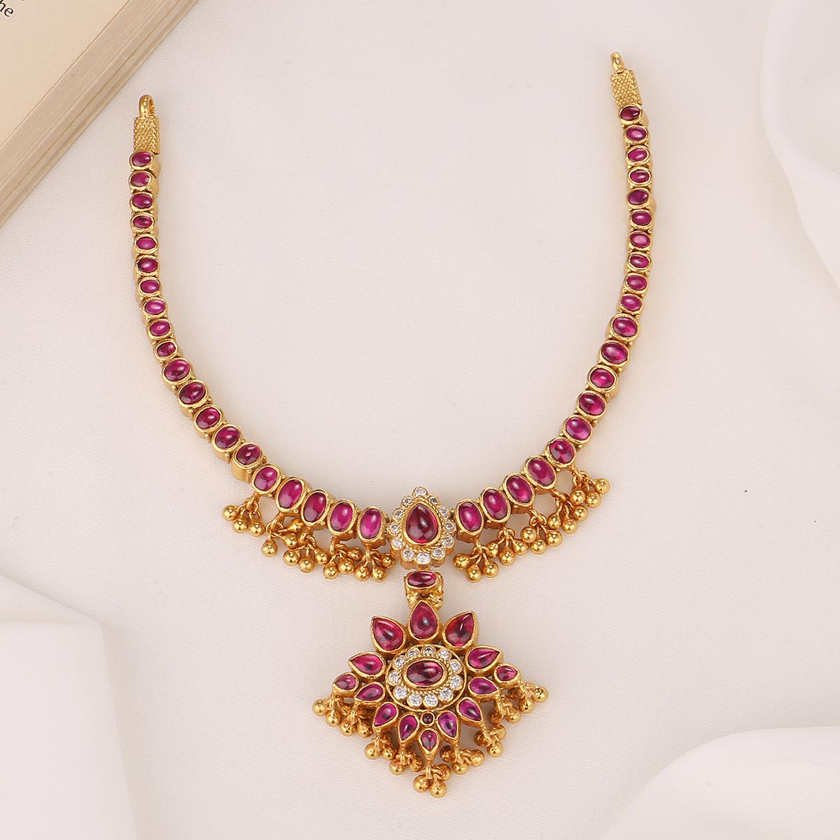 This 92.5 Silver, 24 kt gold-plated, stylish Necklace is studded with semi-precious stones to make a stunning statement. Perfect for any special occasion.