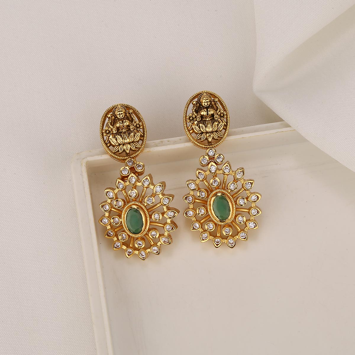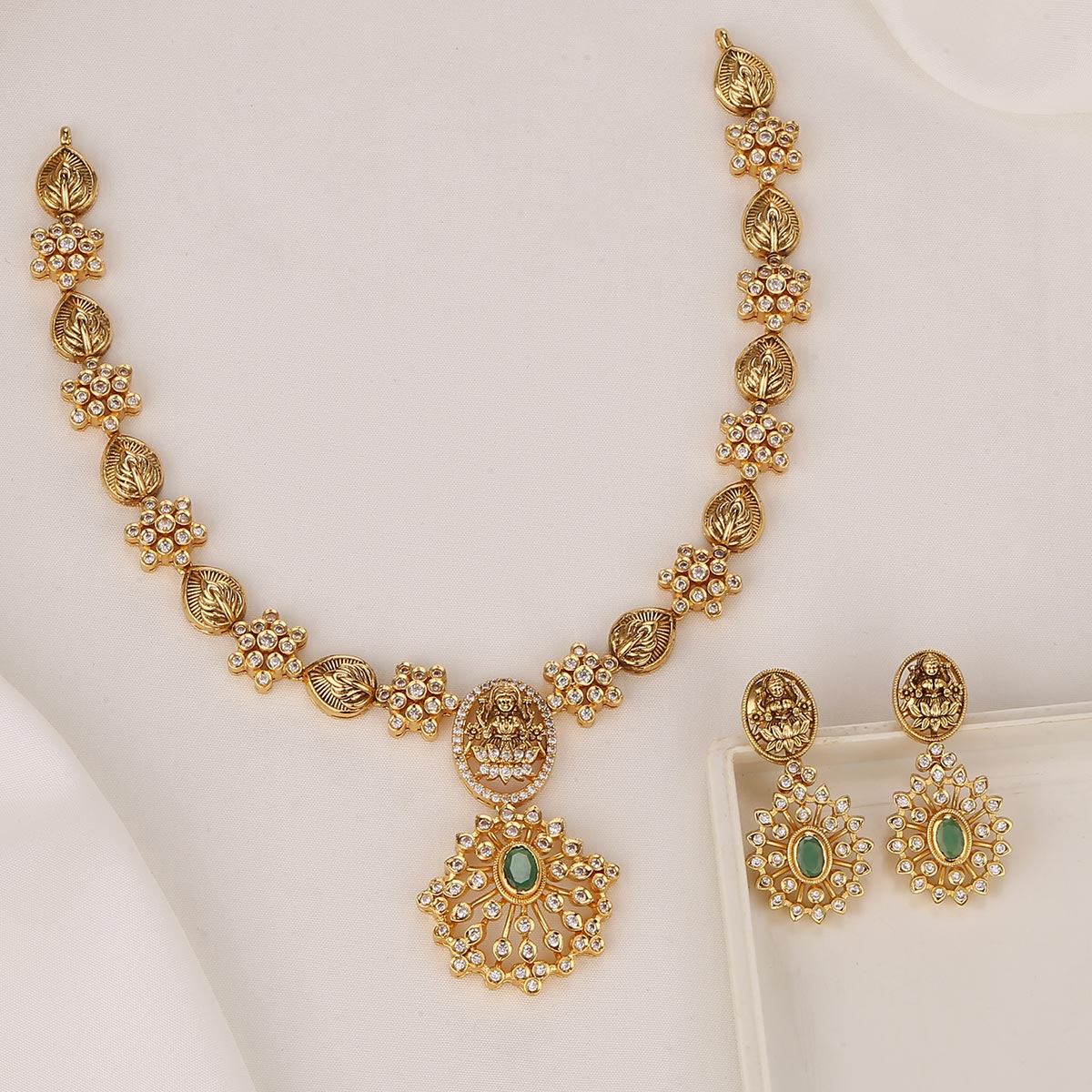 This necklace set is crafted from 92.5 Sterling Silver and features 24-karat gold plating and semiprecious stones.