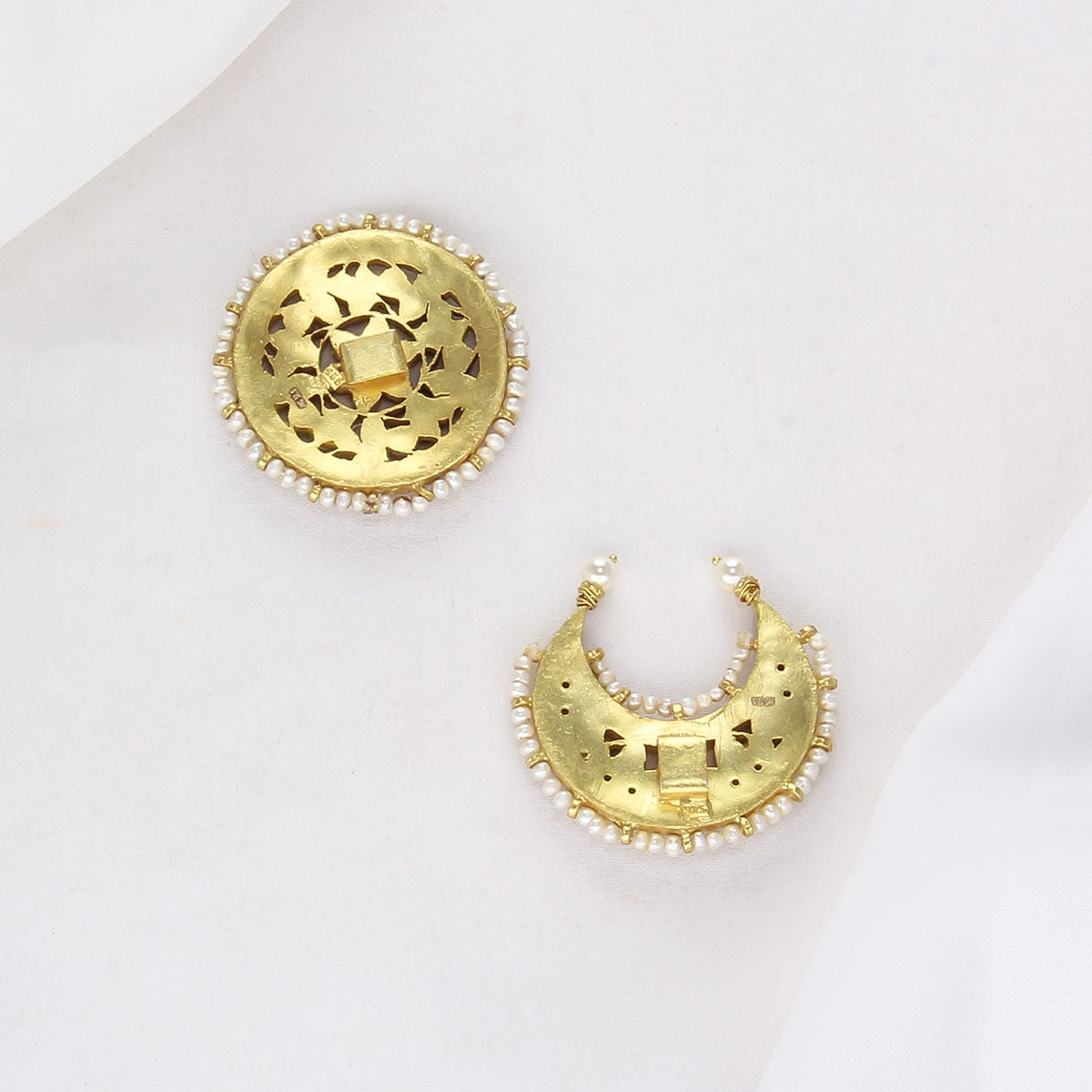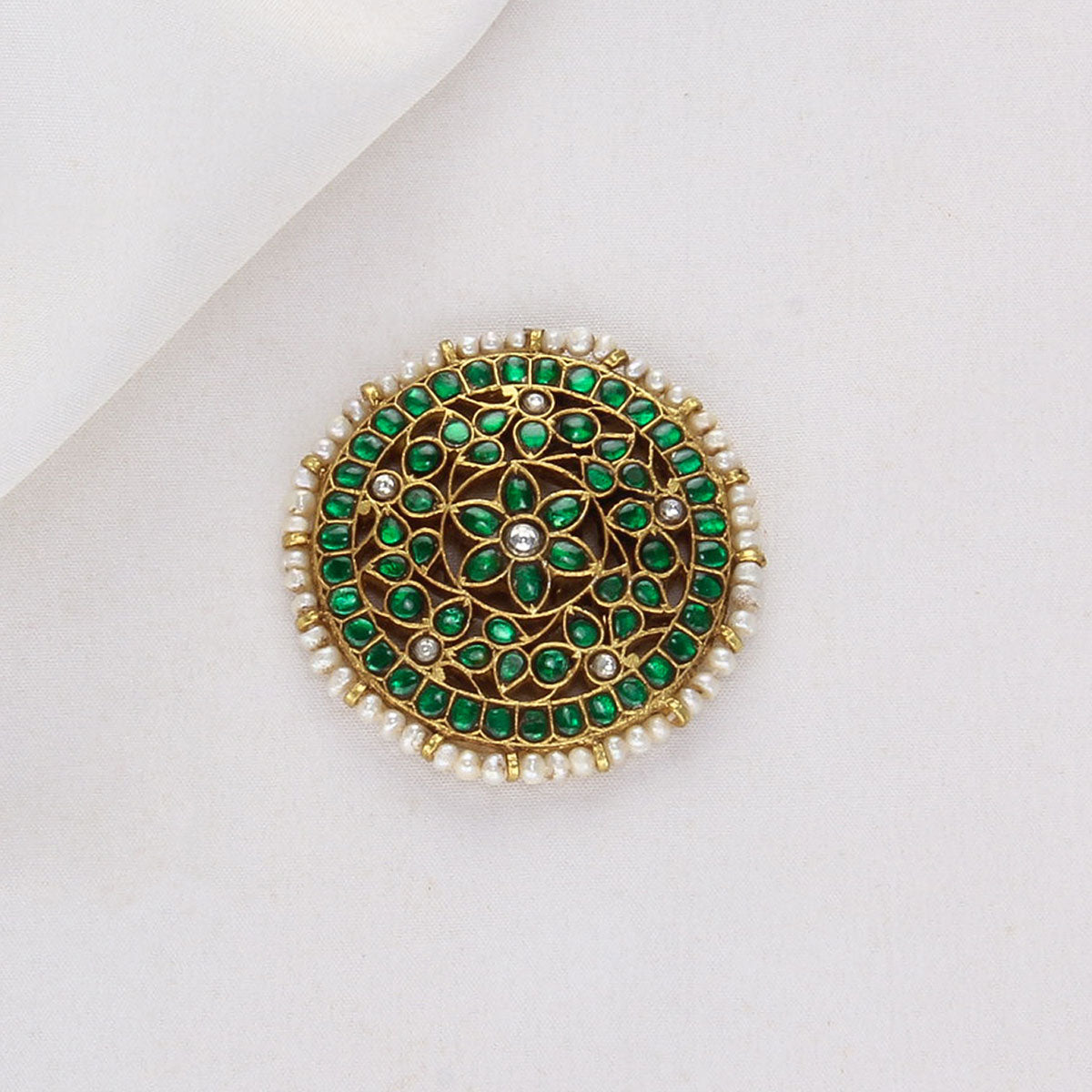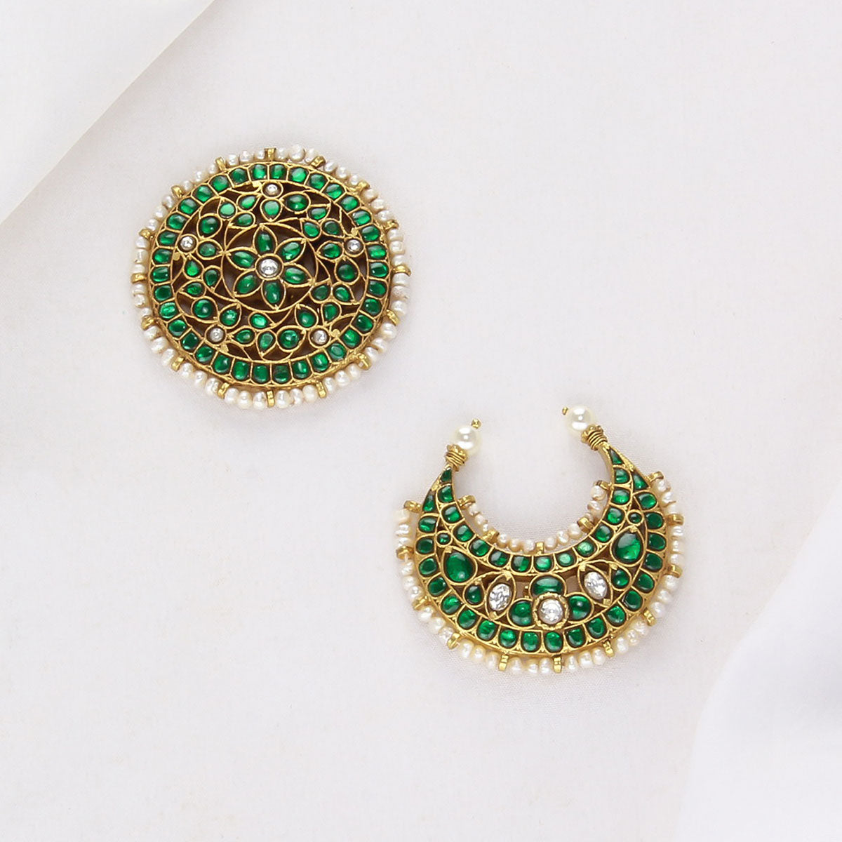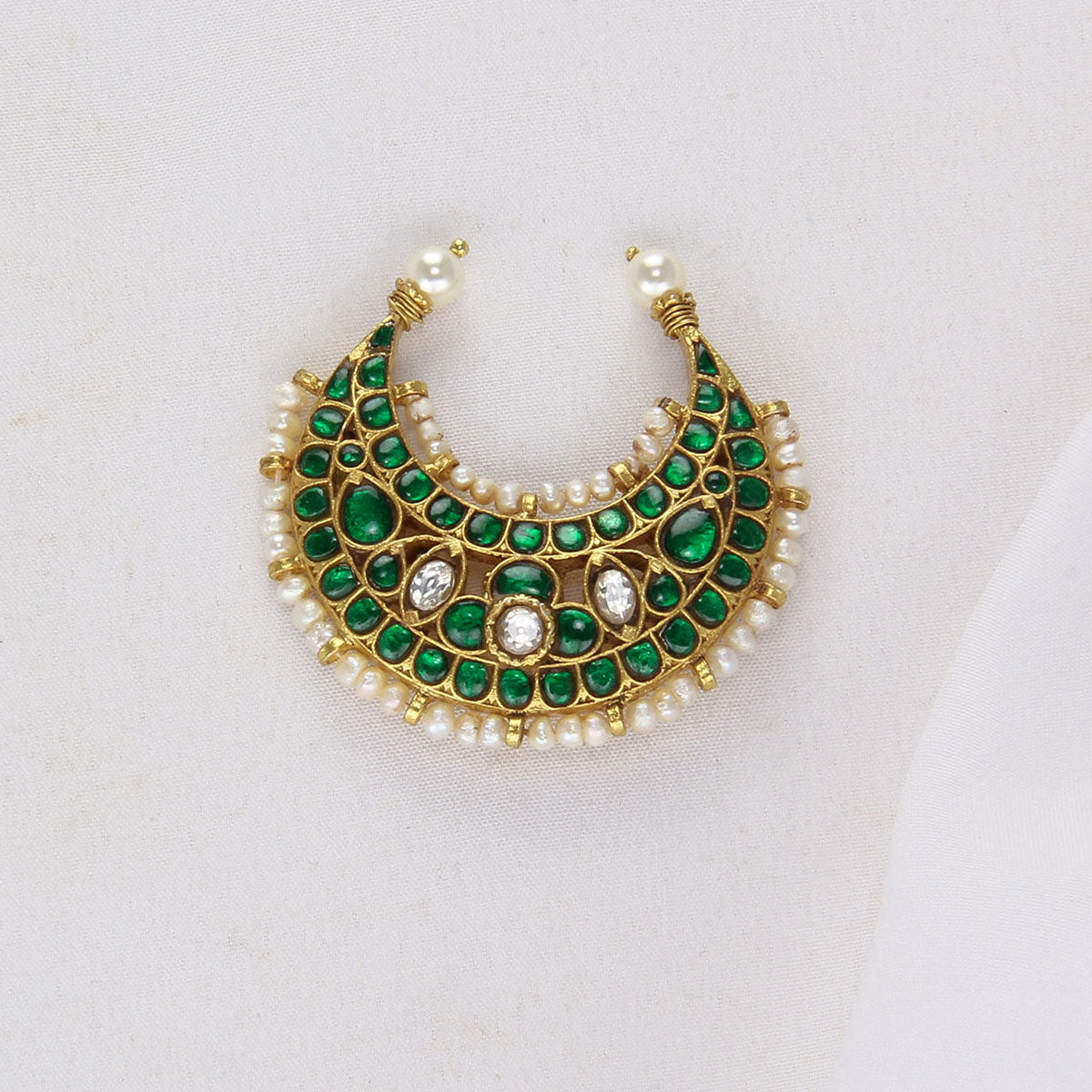 This 92.5 Silver, 24 kt Gold-Plated Jada Billa is adorned with Semi-precious Kundan Stones for an elegant appeal and can be secured using a thread.