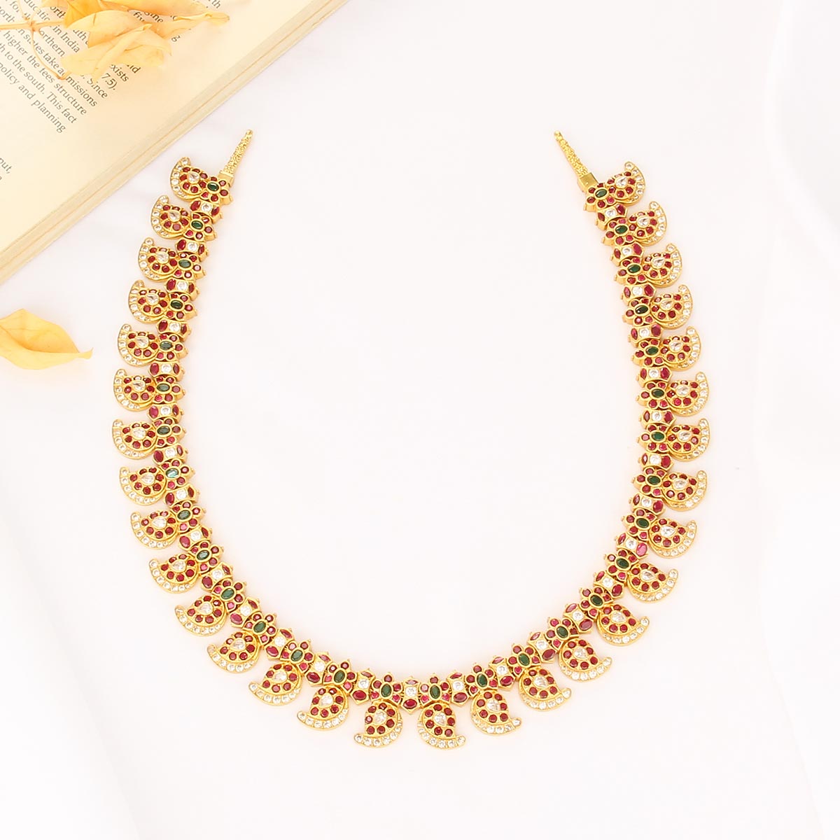 This 92.5 Silver, 24 kt gold-plated, stylish Necklace is studded with semi-precious stones to make a stunning statement. Perfect for any special occasion.