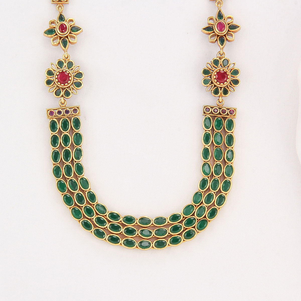 This 92.5 Silver, 24 kt gold-plated, stylish Necklace is studded with semi-precious stones to make a stunning statement. Perfect for any special occasion.