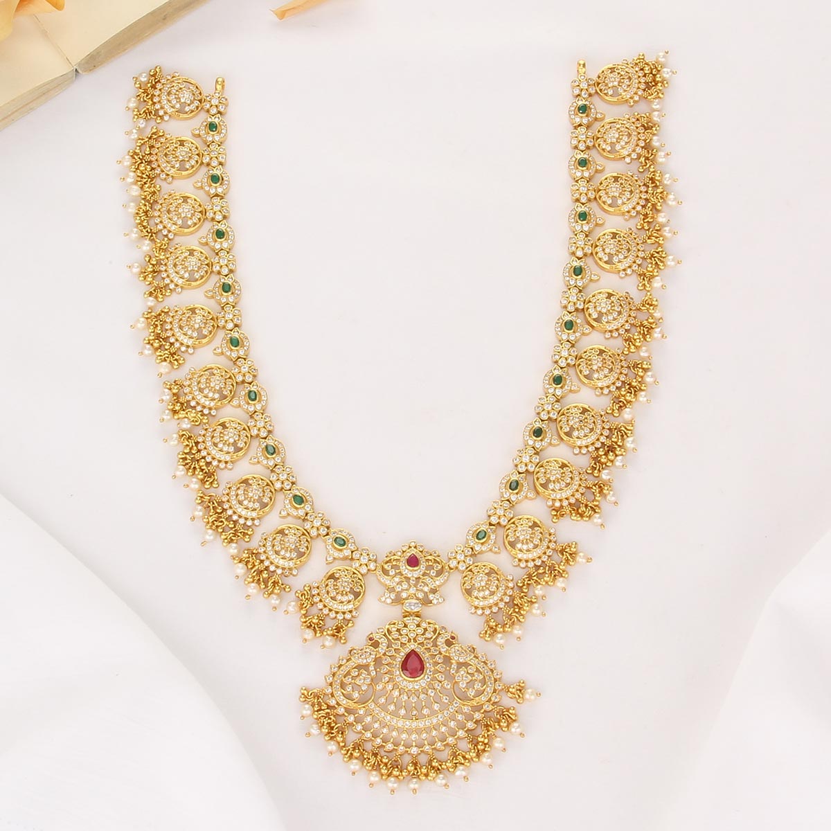 This 92.5 Silver, 24 kt gold-plated, stylish Necklace is studded with semi-precious stones to make a stunning statement. Perfect for any special occasion.