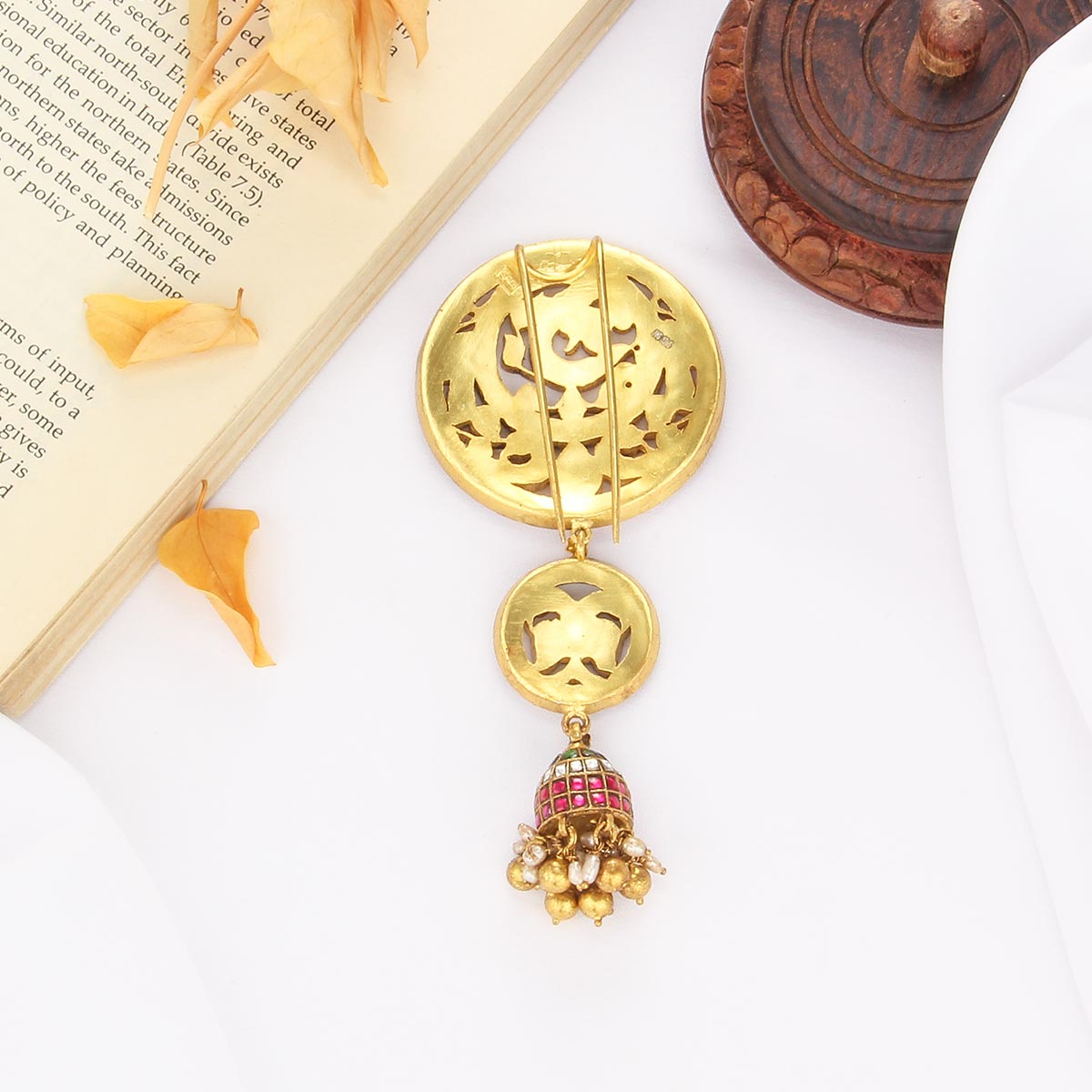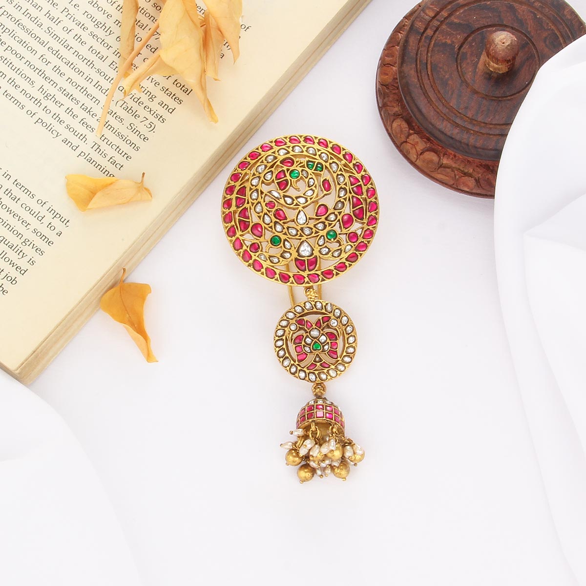 This 92.5 Silver, 24 kt Gold-Plated Jada Billa is adorned with Semi-precious Kundan Stones for a luxurious aesthetic.