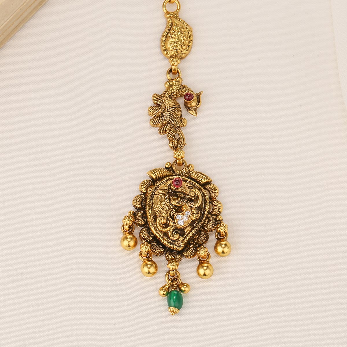 This exquisite Maangtikka will add a glamorous flair to your look. Crafted from 92.5 silver and 24kt gold-plated, it features semi-precious stones for a brilliant shine. Elevate your look with this luxurious Maangtikka.