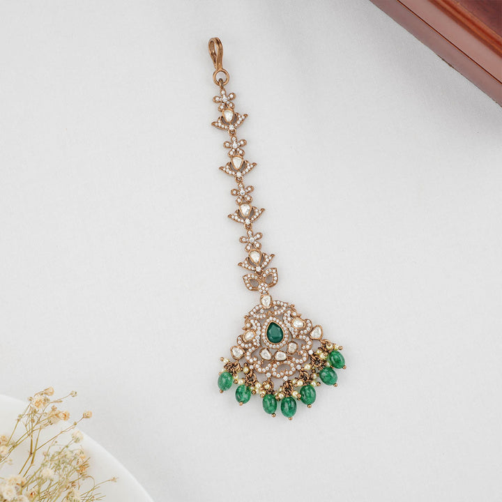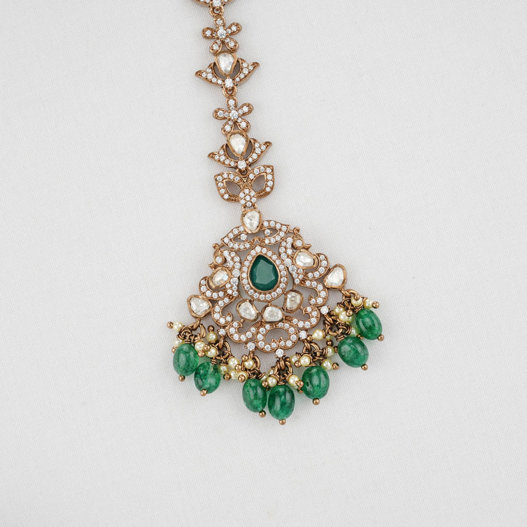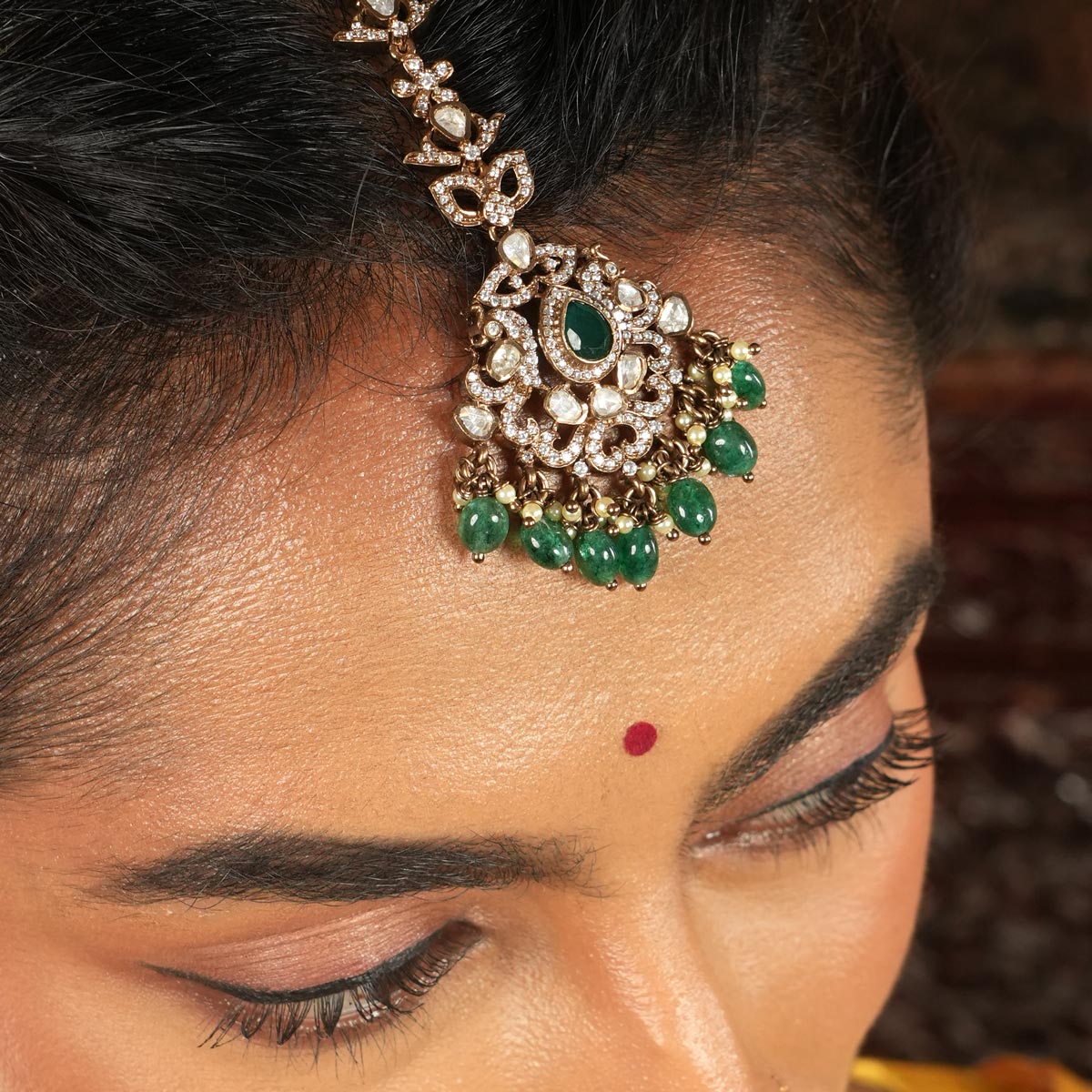 92.5 Silver, Victorian Maangtikka studded with Gem Stones and Pearl Beads.